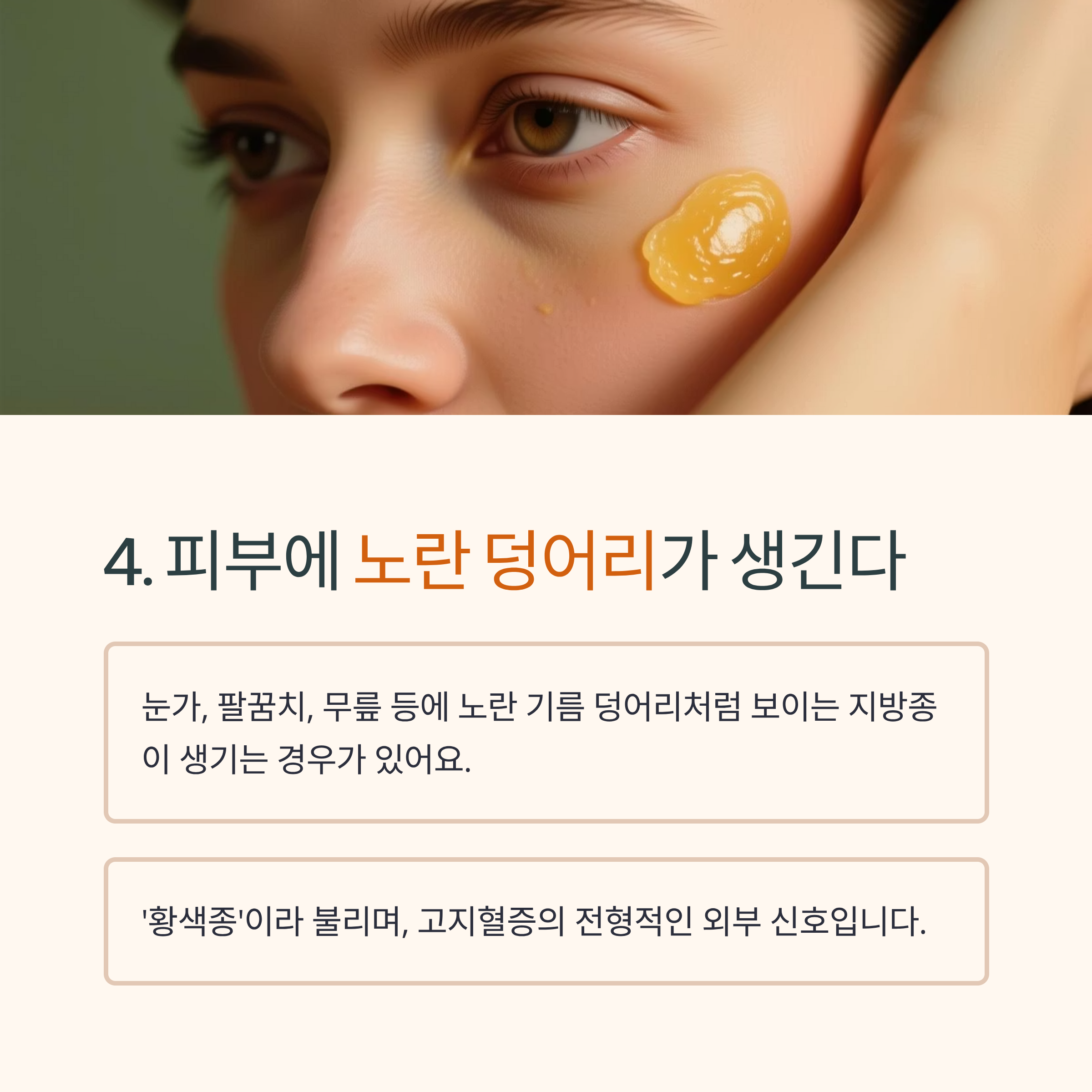 | 피부 변화 | 고지혈증에 의한 황색종 | 전문의 진단 및 식이조절 |