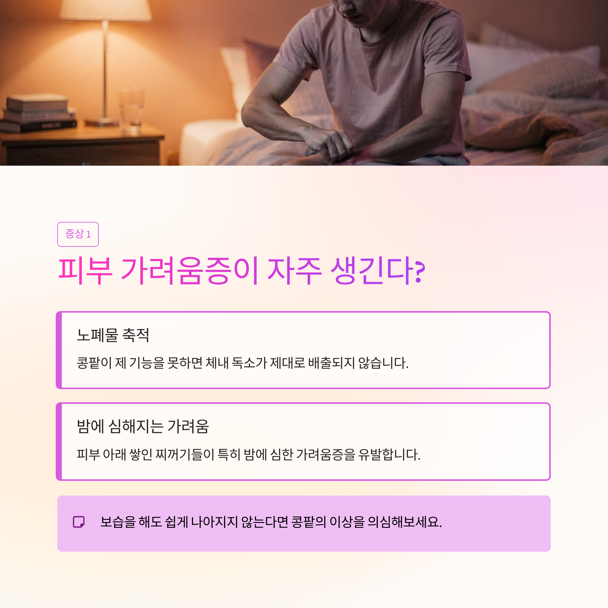 피부에 드러나는 작은 변화도 사실은 콩팥이 보내는 구조 요청일 수 있습니다.