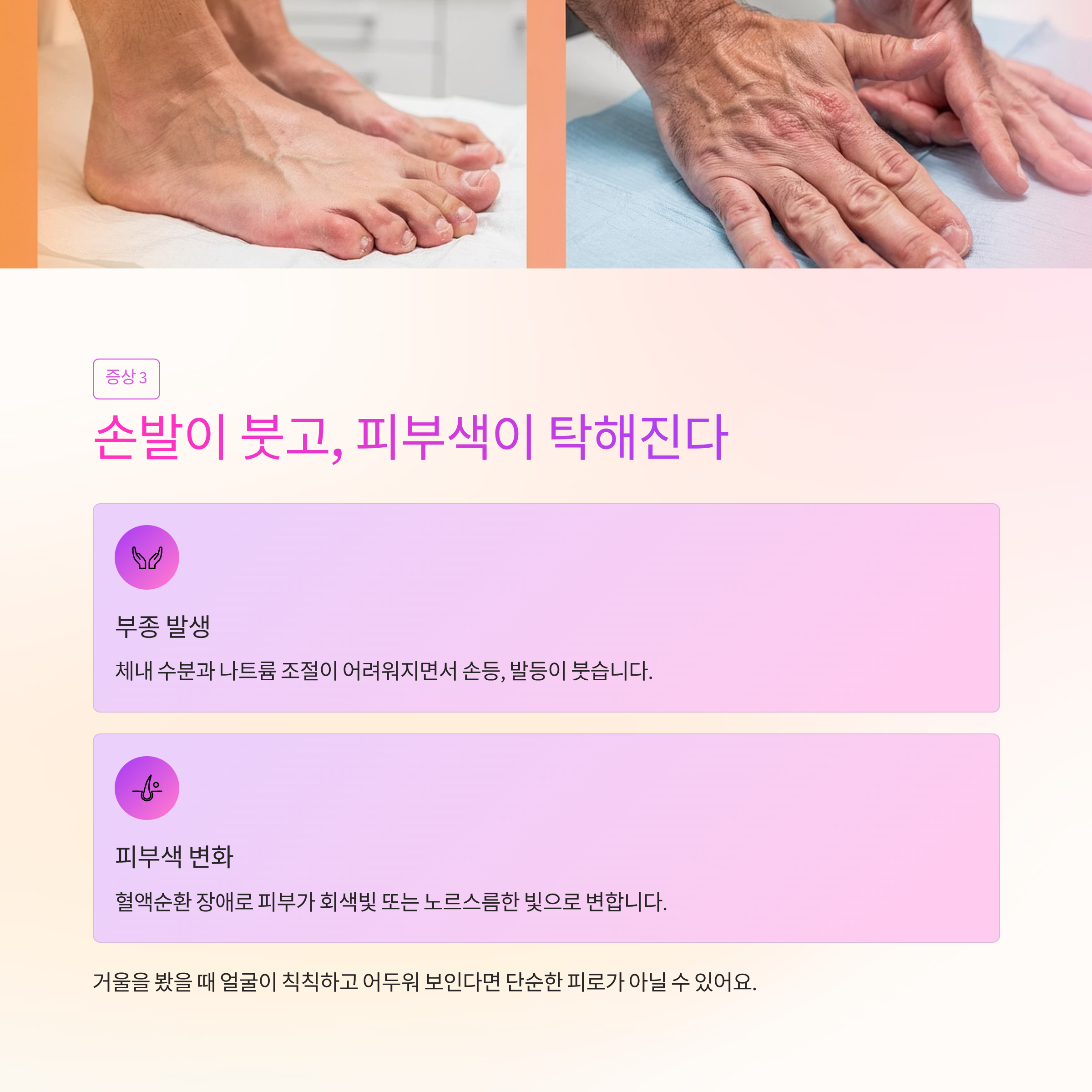 특히 손등, 발등이 붓는다면 주의가 필요합니다.