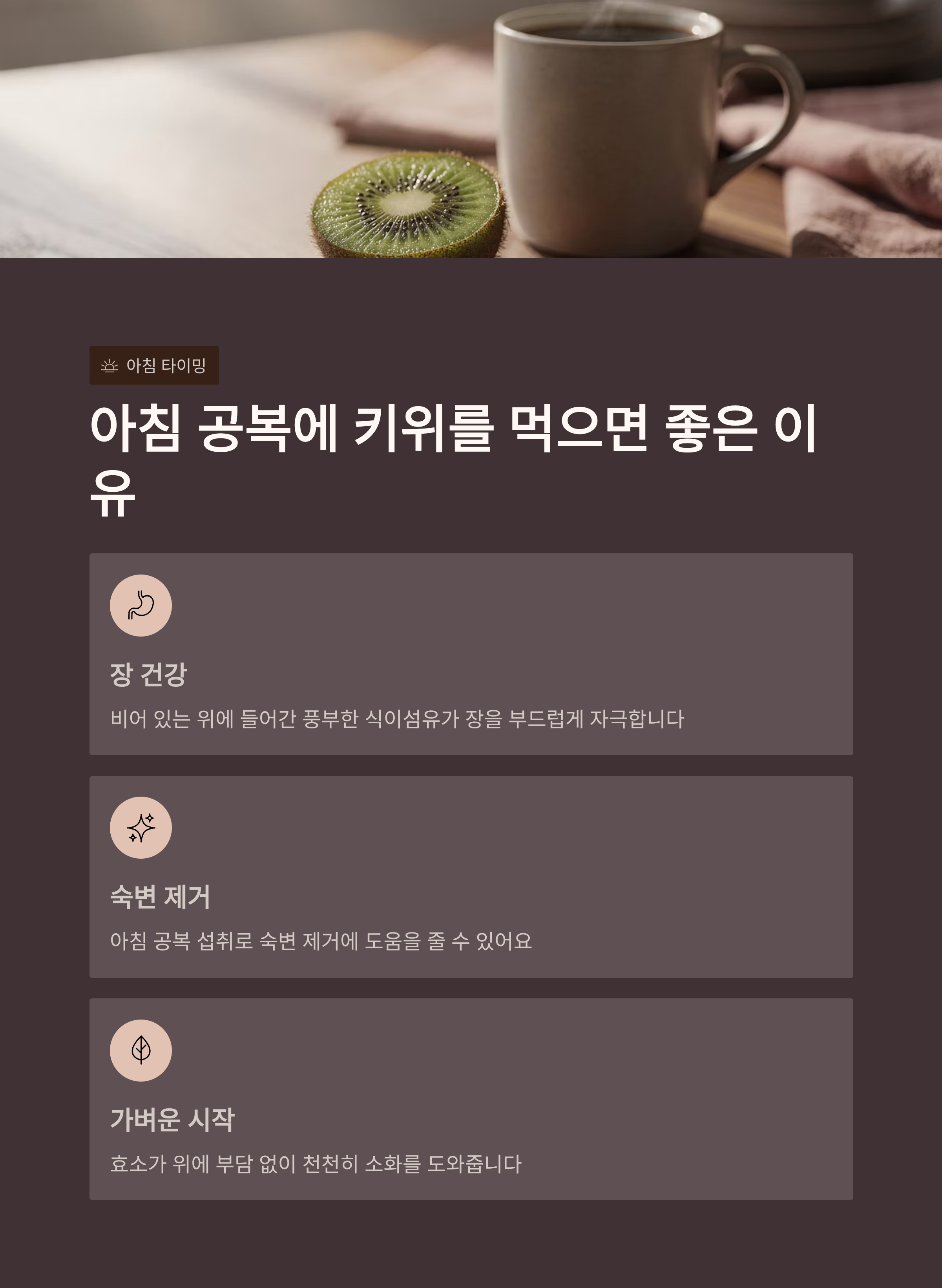 비어 있는 위에 들어간 키위의 풍부한 식이섬유는 장을 부드럽게 자극하고, 숙변 제거에 도움을 줄 수 있어요.