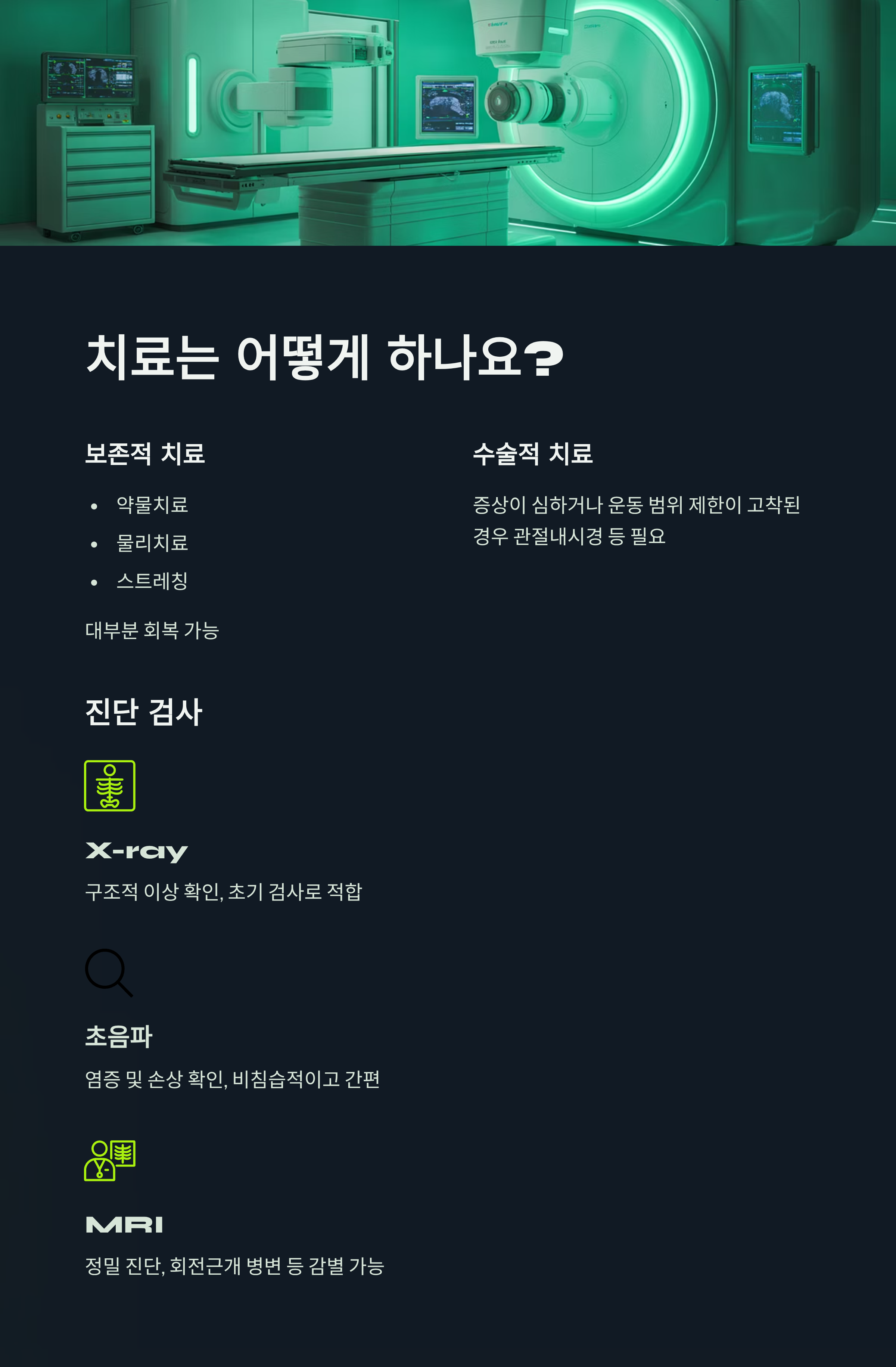 대부분의 경우 약물치료, 물리치료, 스트레칭 등 보존적 치료로 회복이 가능하지만,
