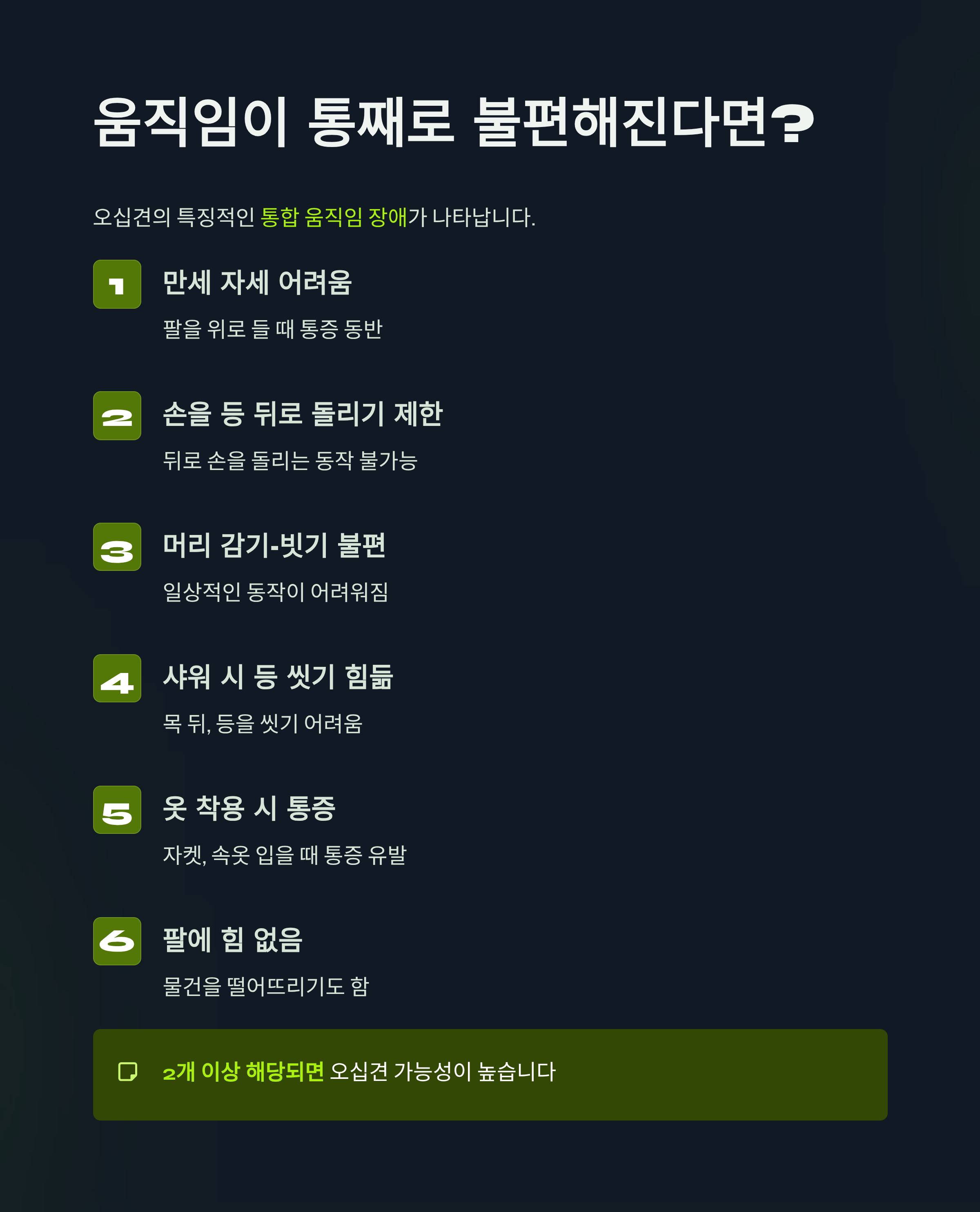 오십견을 의심할 수 있는 주요 체크 항목은 다음과 같습니다.