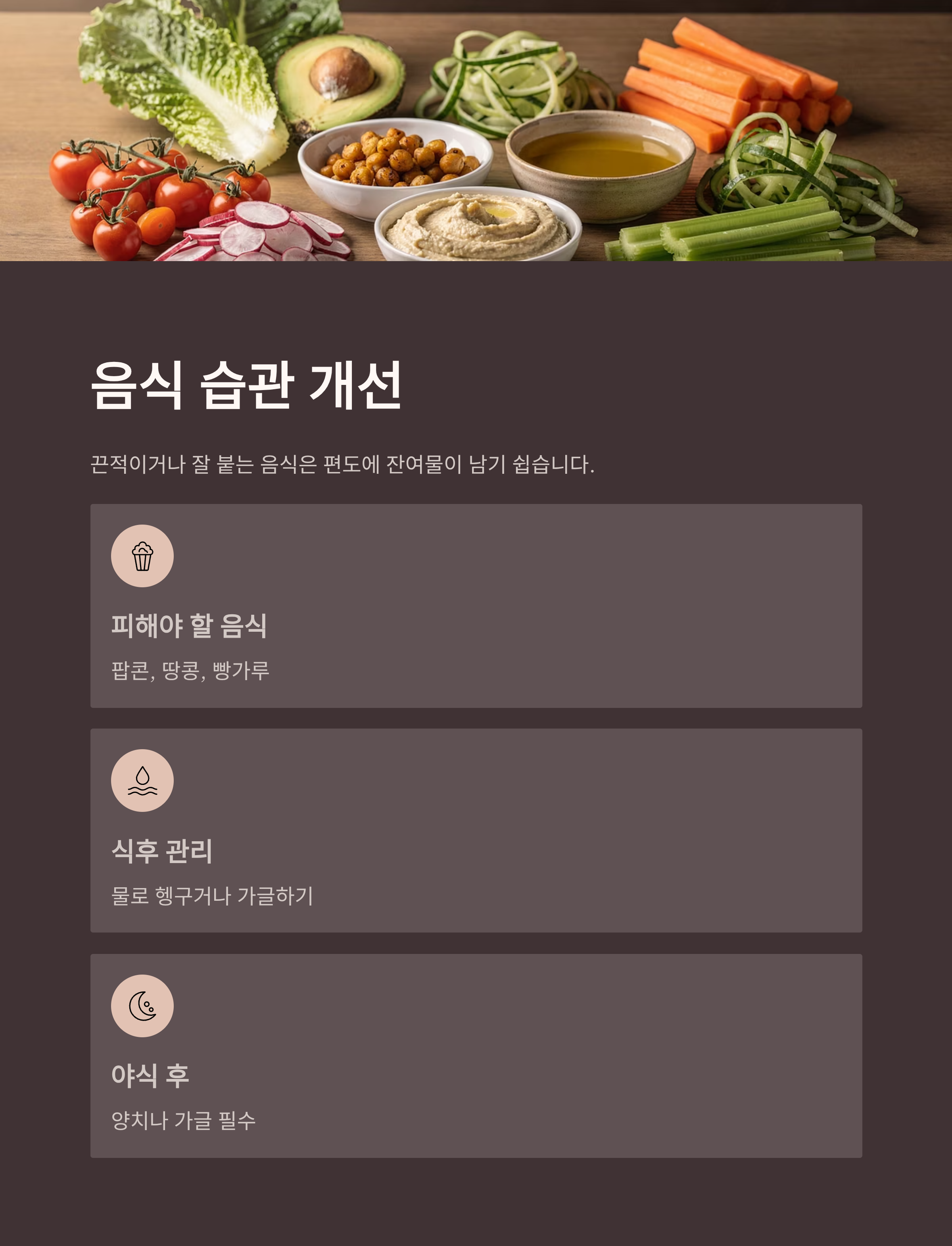 | 자극적 음식 피하기 | 입 안쪽에 잔여물 남기 쉬운 음식 자제 |