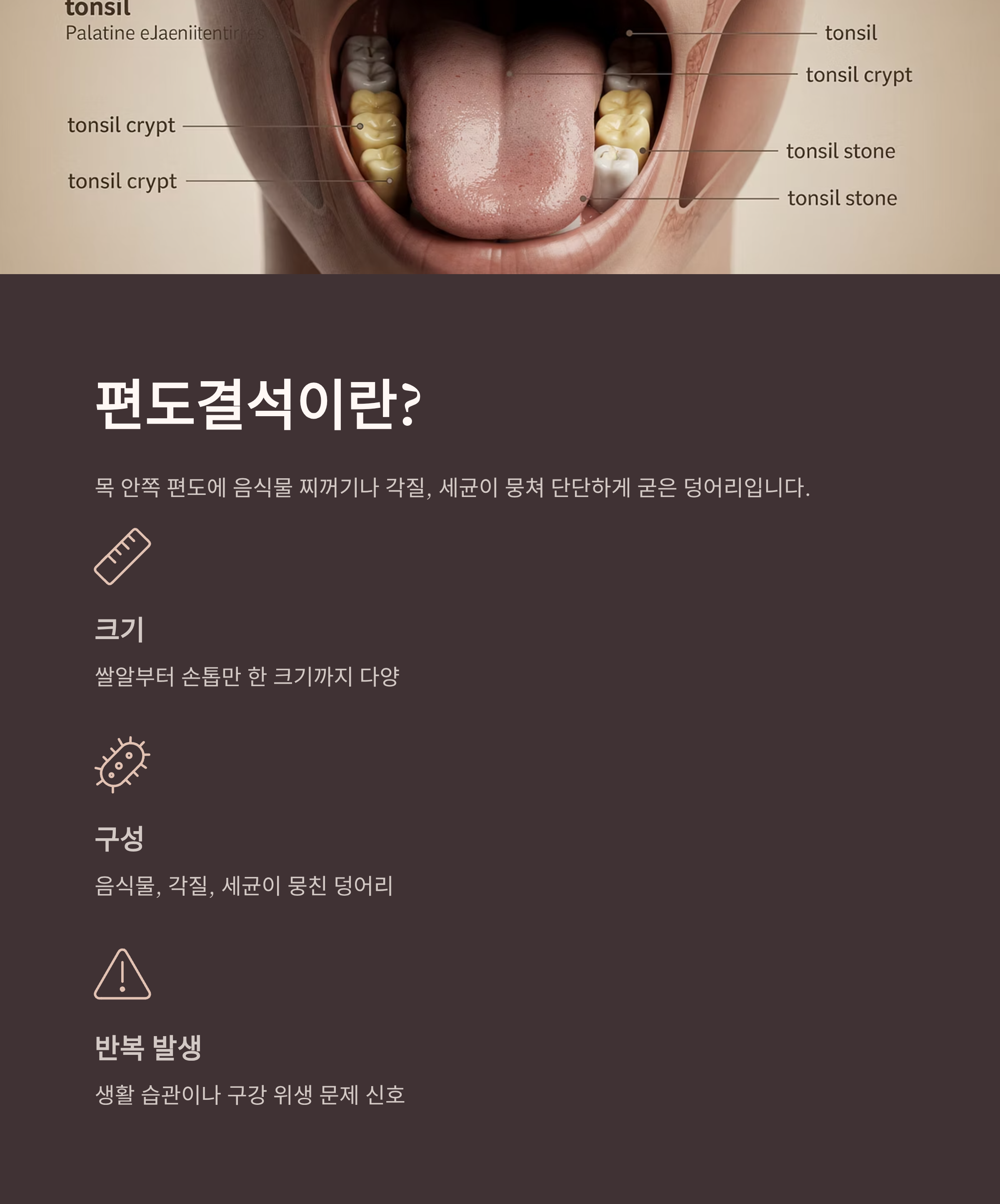 편도결석은 목 안쪽 편도에 음식물 찌꺼기나 각질, 세균이 뭉쳐 단단하게 굳은 덩어리입니다.