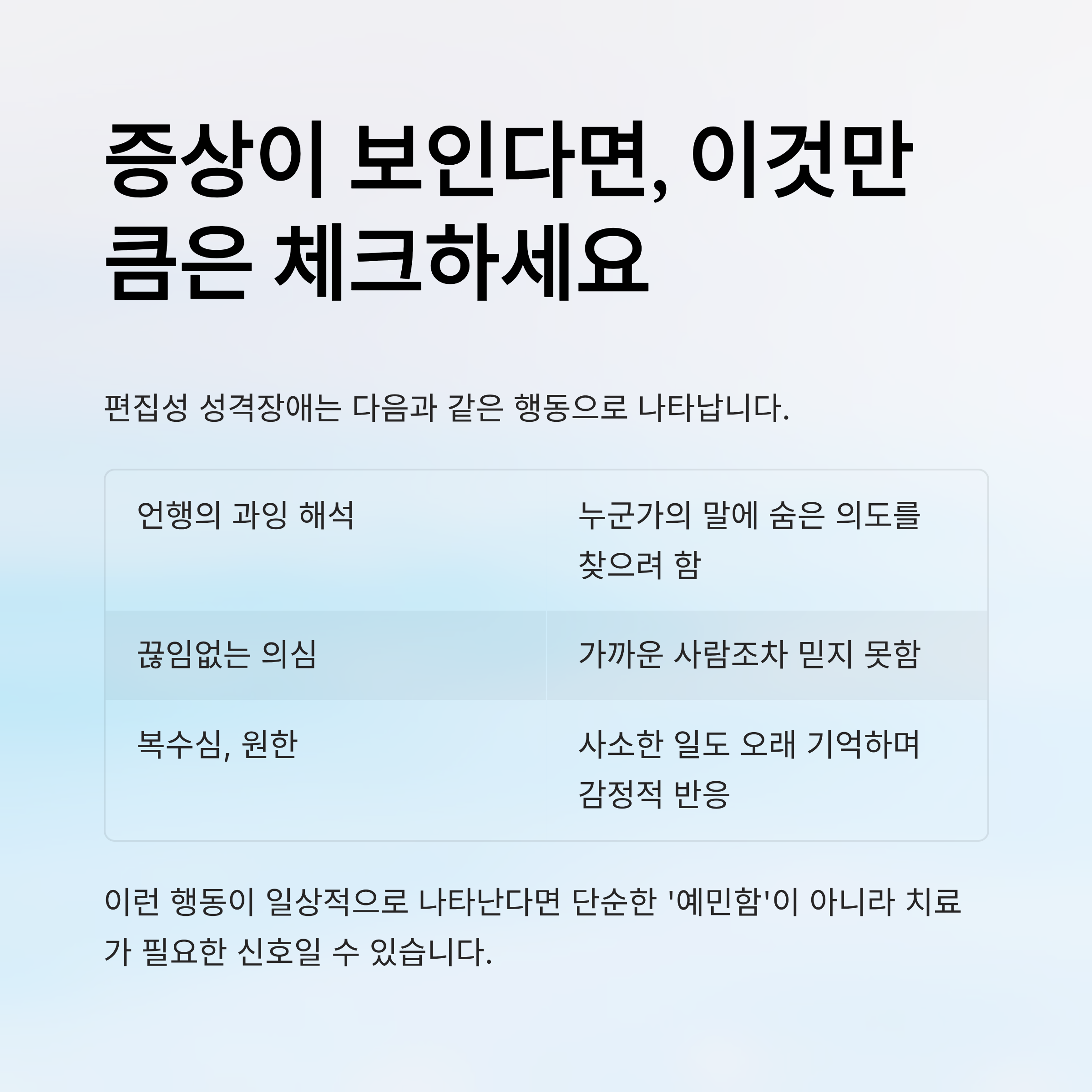 편집성 성격장애는 이런 ‘과도한 의심’이 일상에 자리 잡는 것이 특징입니다.
