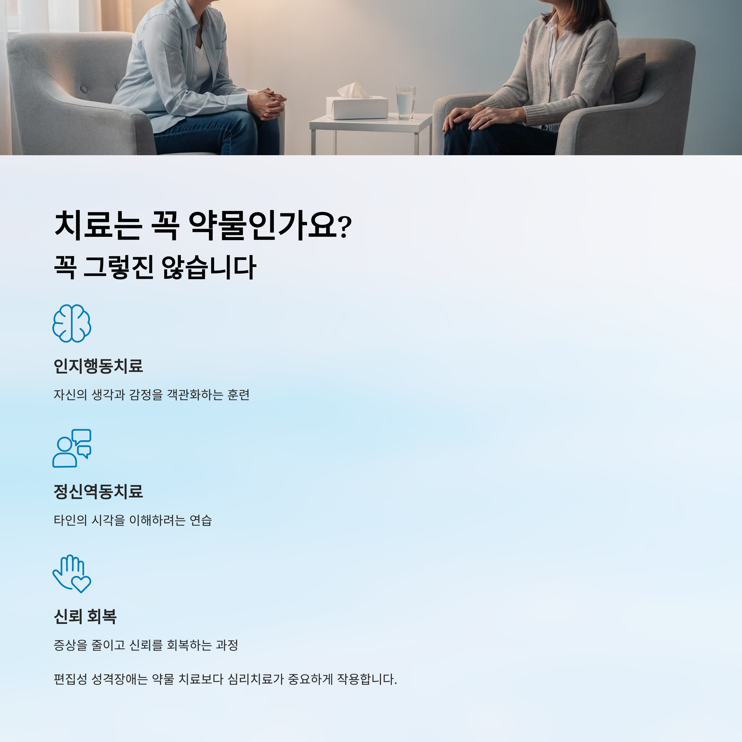 편집성 성격장애는 약물 치료보다 심리치료, 특히 인지행동치료나 정신역동치료가 중요하게 작용합니다.