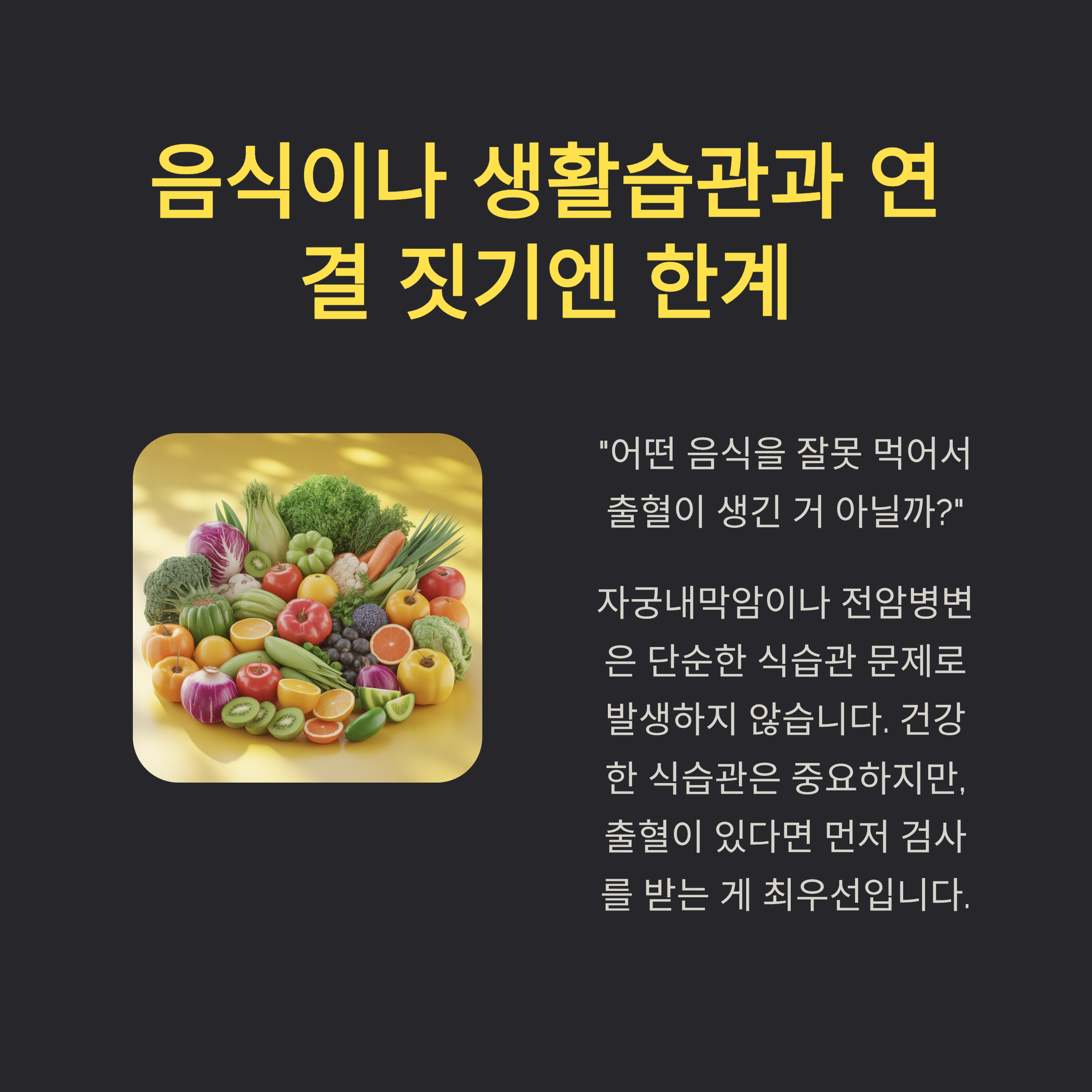 "어떤 음식을 잘못 먹어서 출혈이 생긴 거 아닐까?"라는 생각, 누구나 할 수 있습니다. 하지만 자궁내막암이나 전암병변은 단순한 식습관 문제로 발생하지 않습니다. 물론 건강한 식습관은 중요하지만, 출혈이 있다면 먼저 검사를 받는 게 최우선입니다.