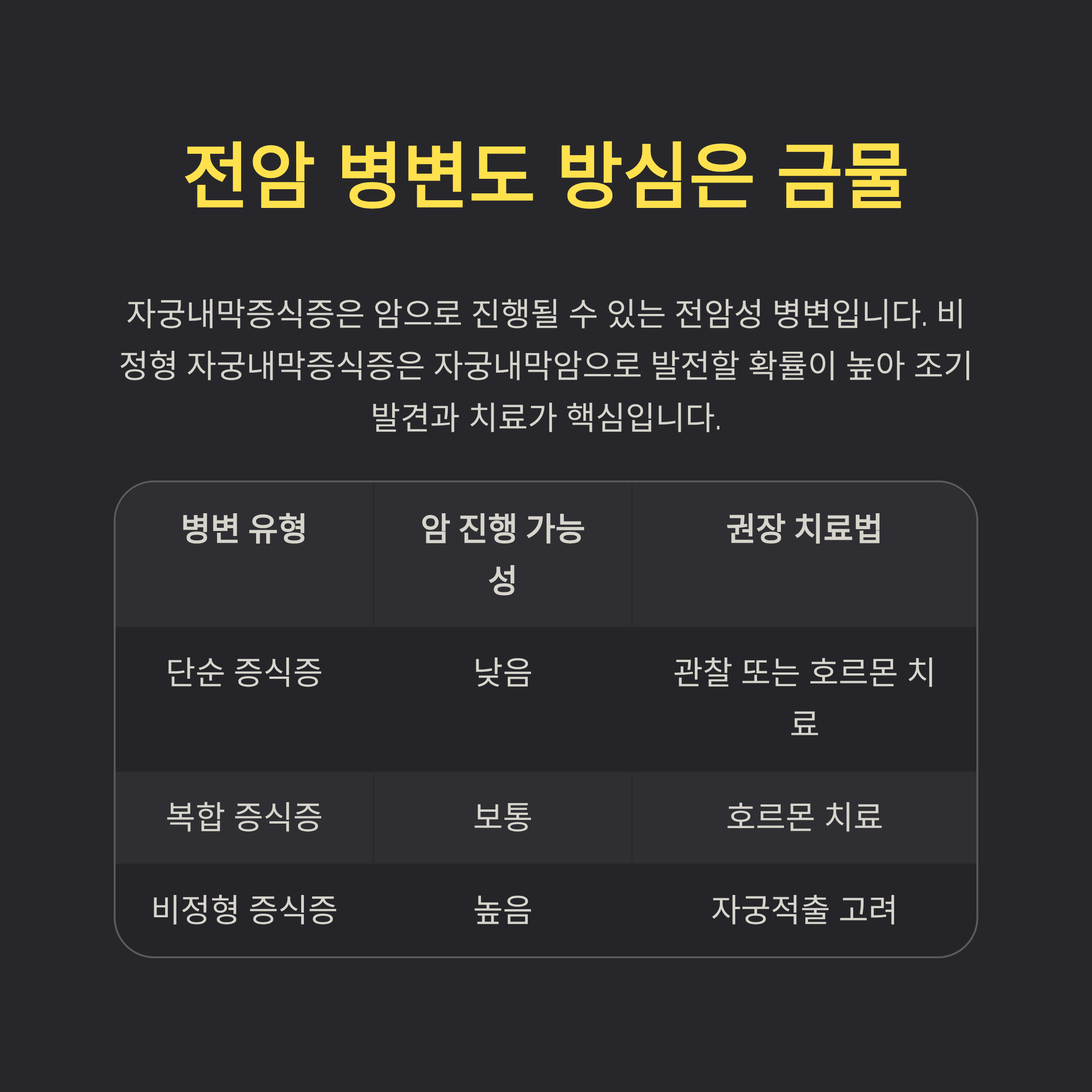 자궁내막증식증은 암으로 진행될 수 있는 전암성 병변입니다. 특히 비정형 자궁내막증식증은 자궁내막암으로 발전할 확률이 높은 편이기 때문에 조기 발견과 치료가 핵심입니다.