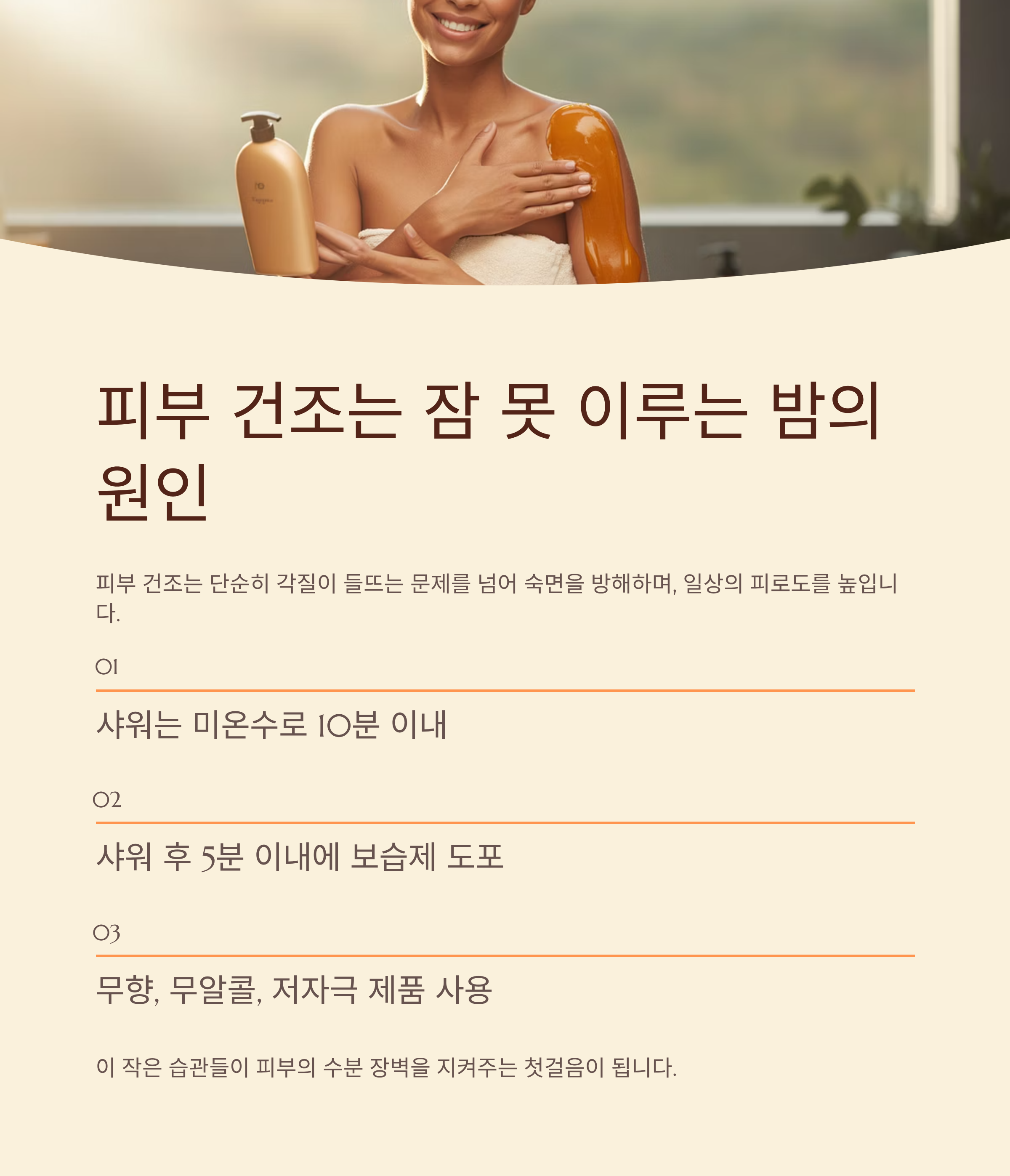 밤에 피부가 당기고 가려워지면 숙면을 방해하며, 반복되면 일상의 피로도를 높이는 악순환이 발생합니다.