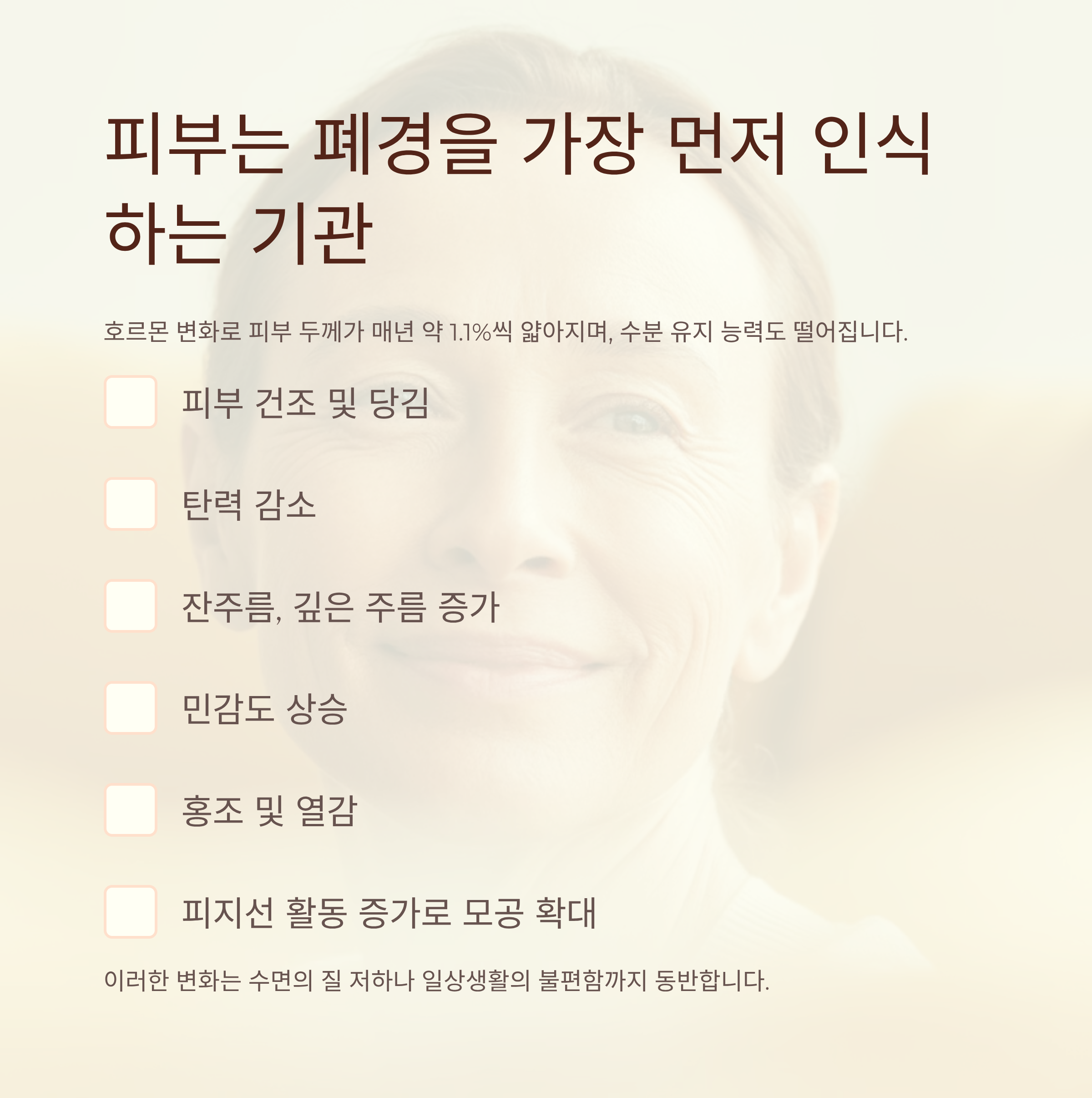 특히 폐경기 초입에서는 피부 변화가 곧 몸 전체의 상태를 반영하는 경고등이 될 수 있습니다.