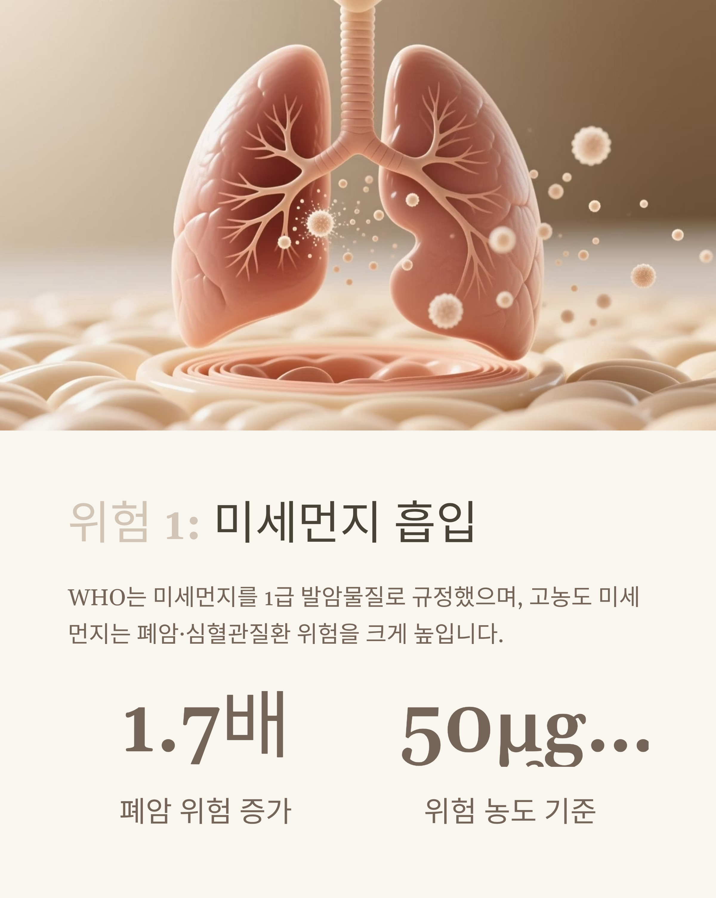 미세먼지, 특히 PM2.5는 크기가 매우 작아 폐포까지 침투해 제거되지 않고 쌓입니다. WHO는 이를 1급 발암물질로 규정했으며, 고농도 미세먼지는 폐암·심혈관질환 위험을 크게 높입니다. 실외 미세먼지 농도가 50μg/㎥ 이상일 경우 활동을 줄이고 KF94 이상 마스크를 착용하는 것이 핵심입니다.