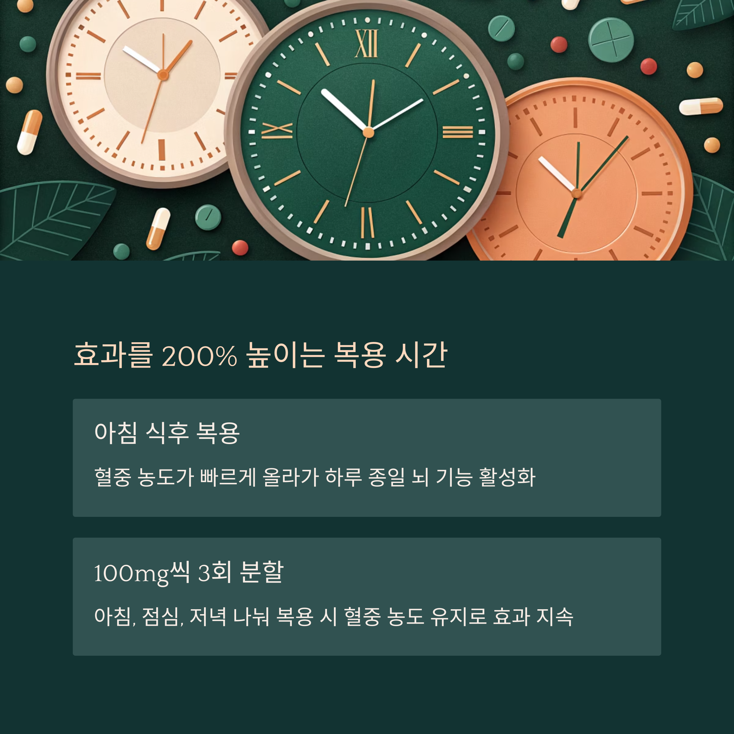 아침 식후 또는 100mg씩 3회 분할 섭취가 가장 이상적인 방법입니다.