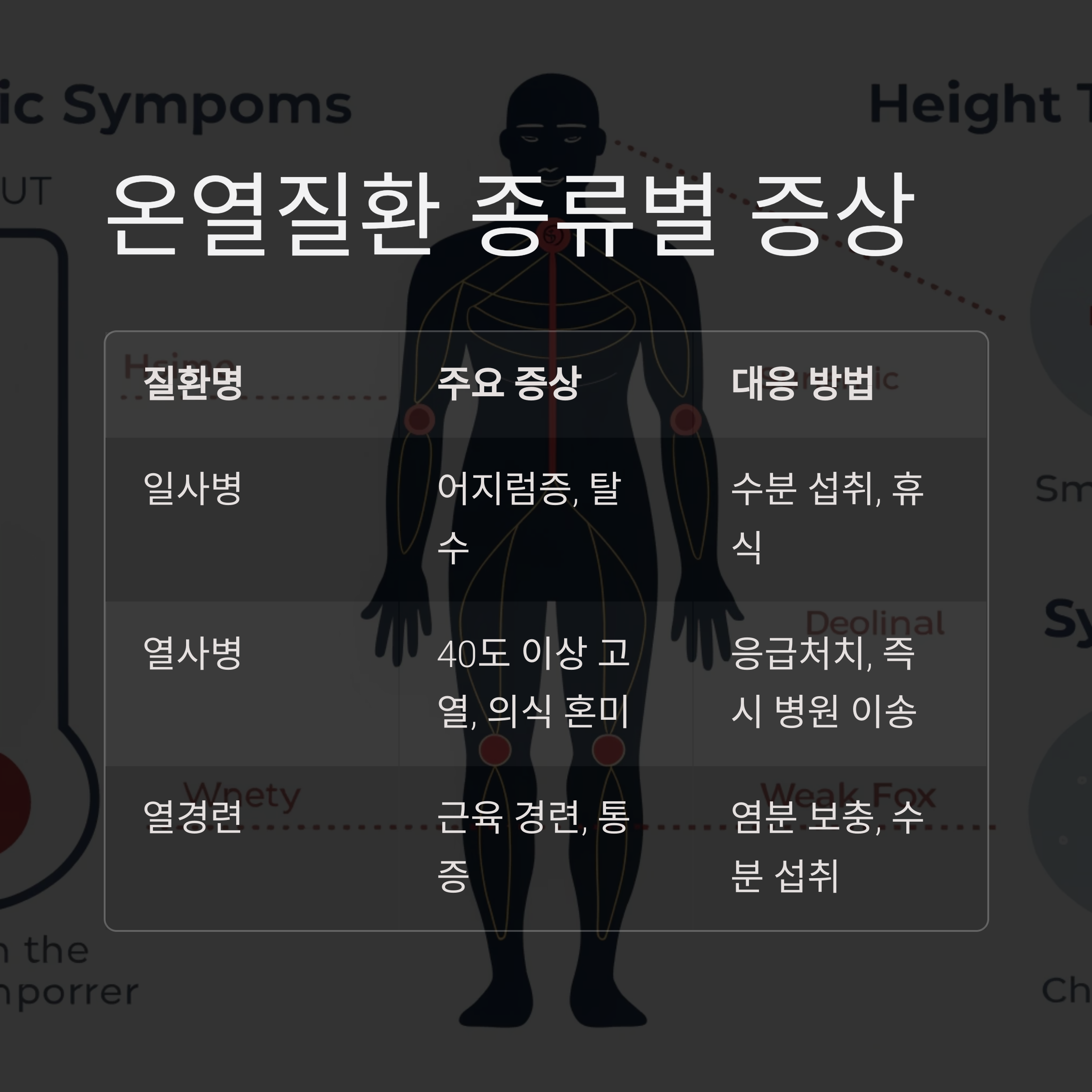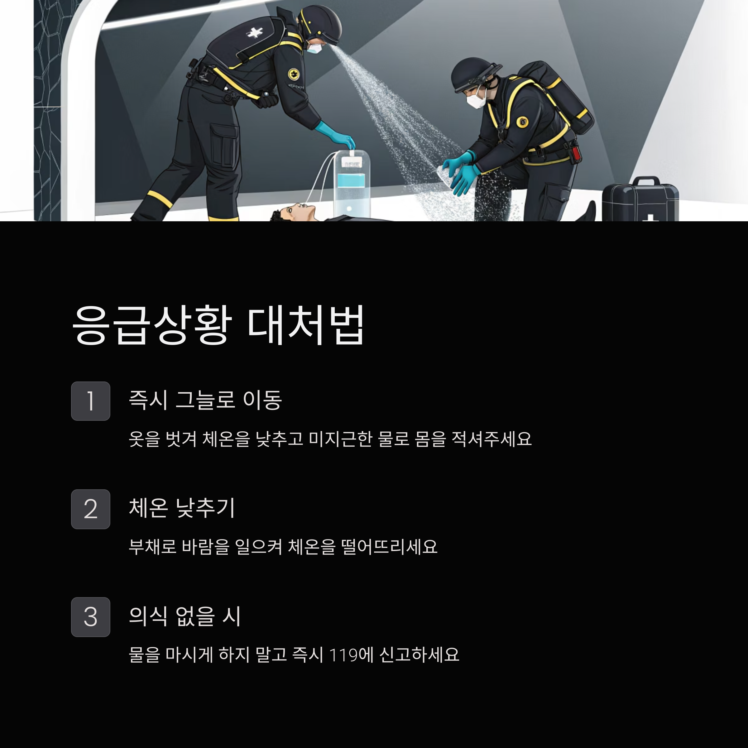 | 열사병 | 40도 이상 고열, 의식 혼미 | 체온조절 중추 마비 | 응급처치, 즉시 병원 이송 |