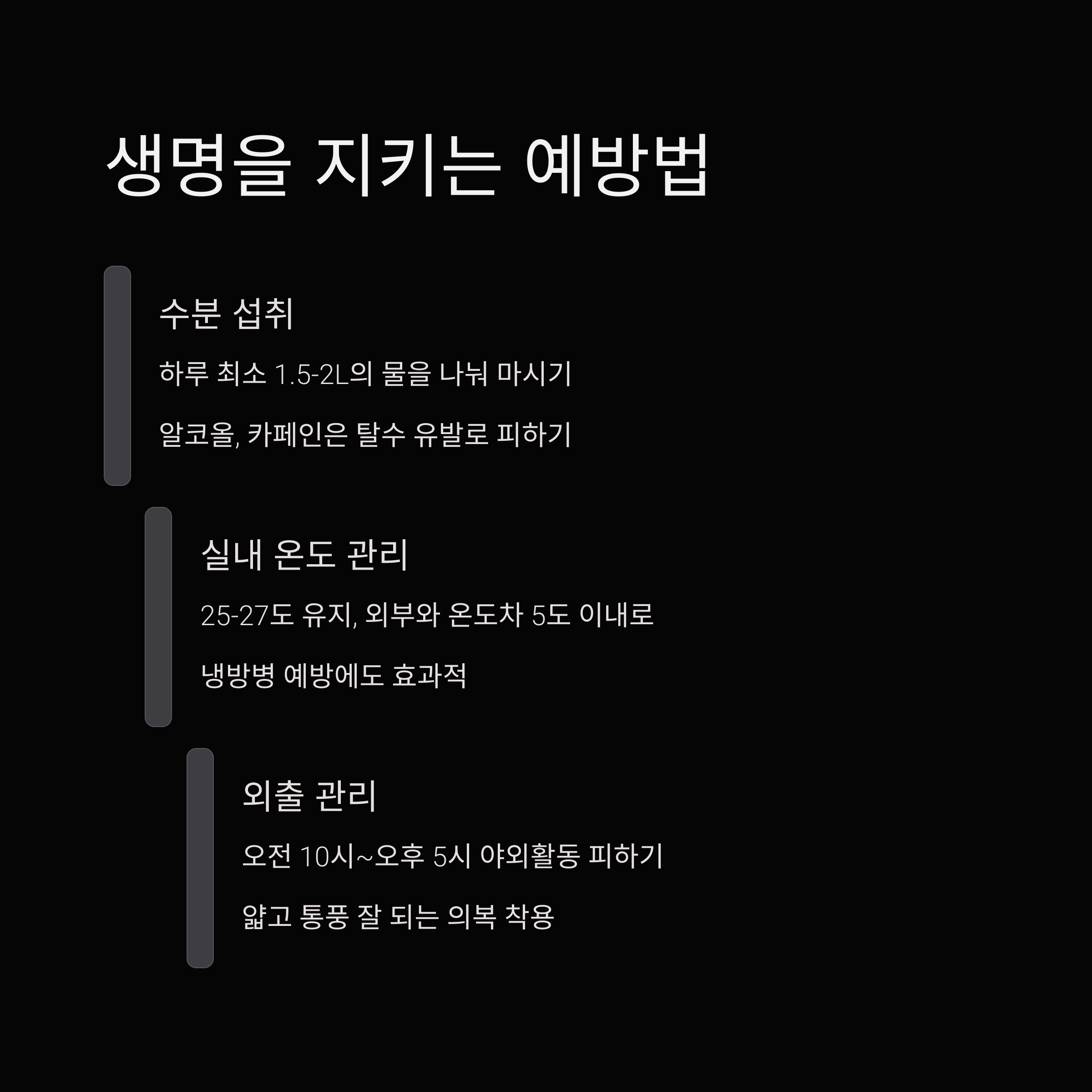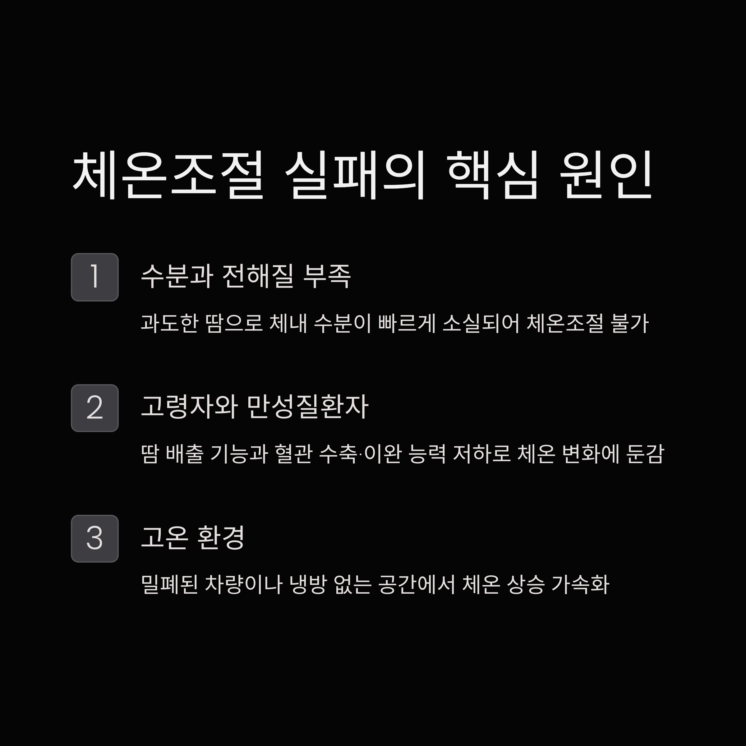 | 65세 이상 | 땀 분비 기능 저하, 만성질환 | 규칙적 수분 섭취, 낮 외출 자제 |