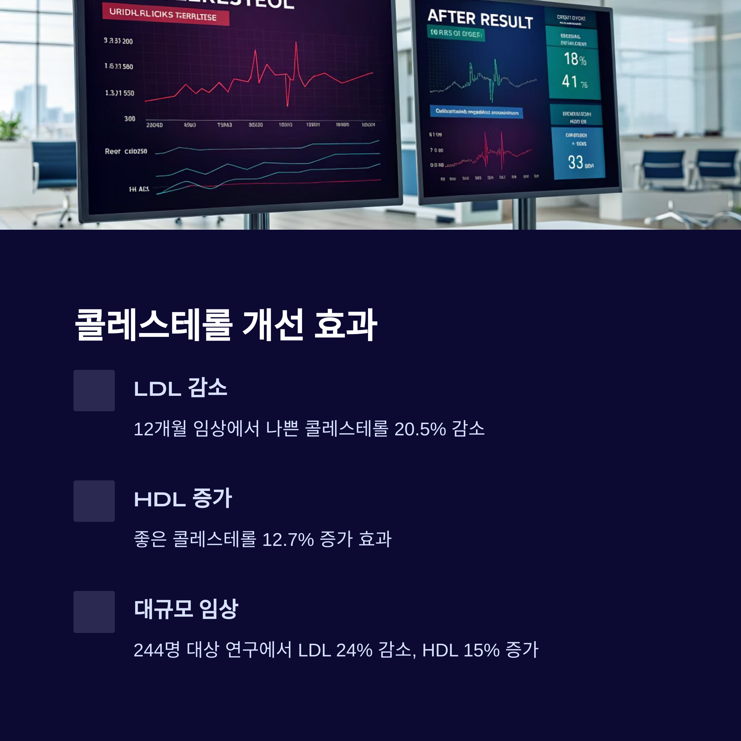 | LDL 감소 | 244명, 고콜레스테롤 환자 | 24% 감소 |