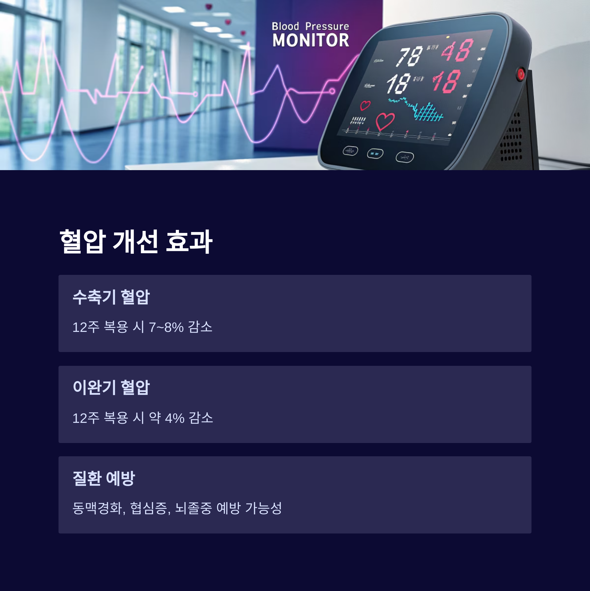 | 수축기 혈압 감소 | 12주, 고혈압 환자 | 7~8% 감소 |