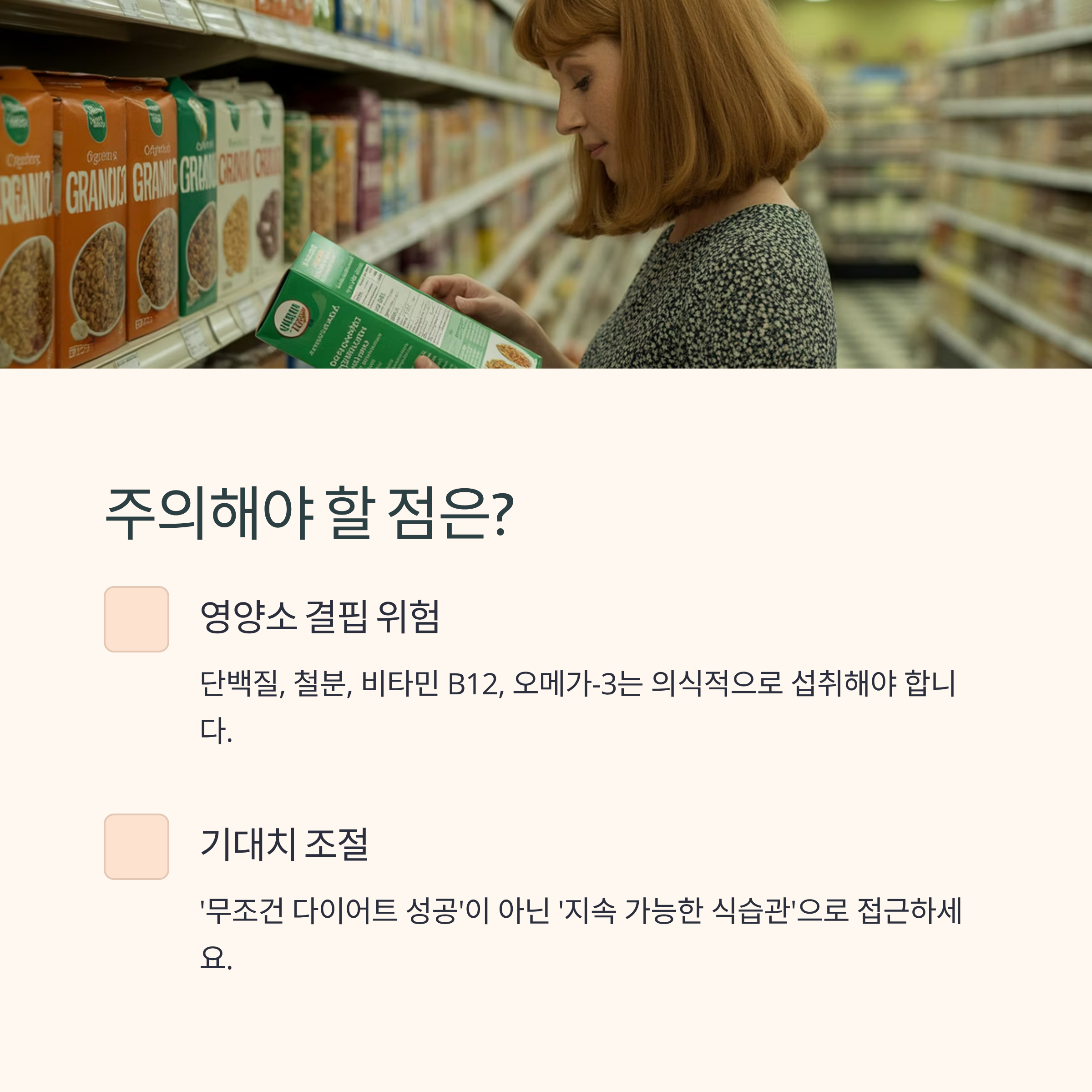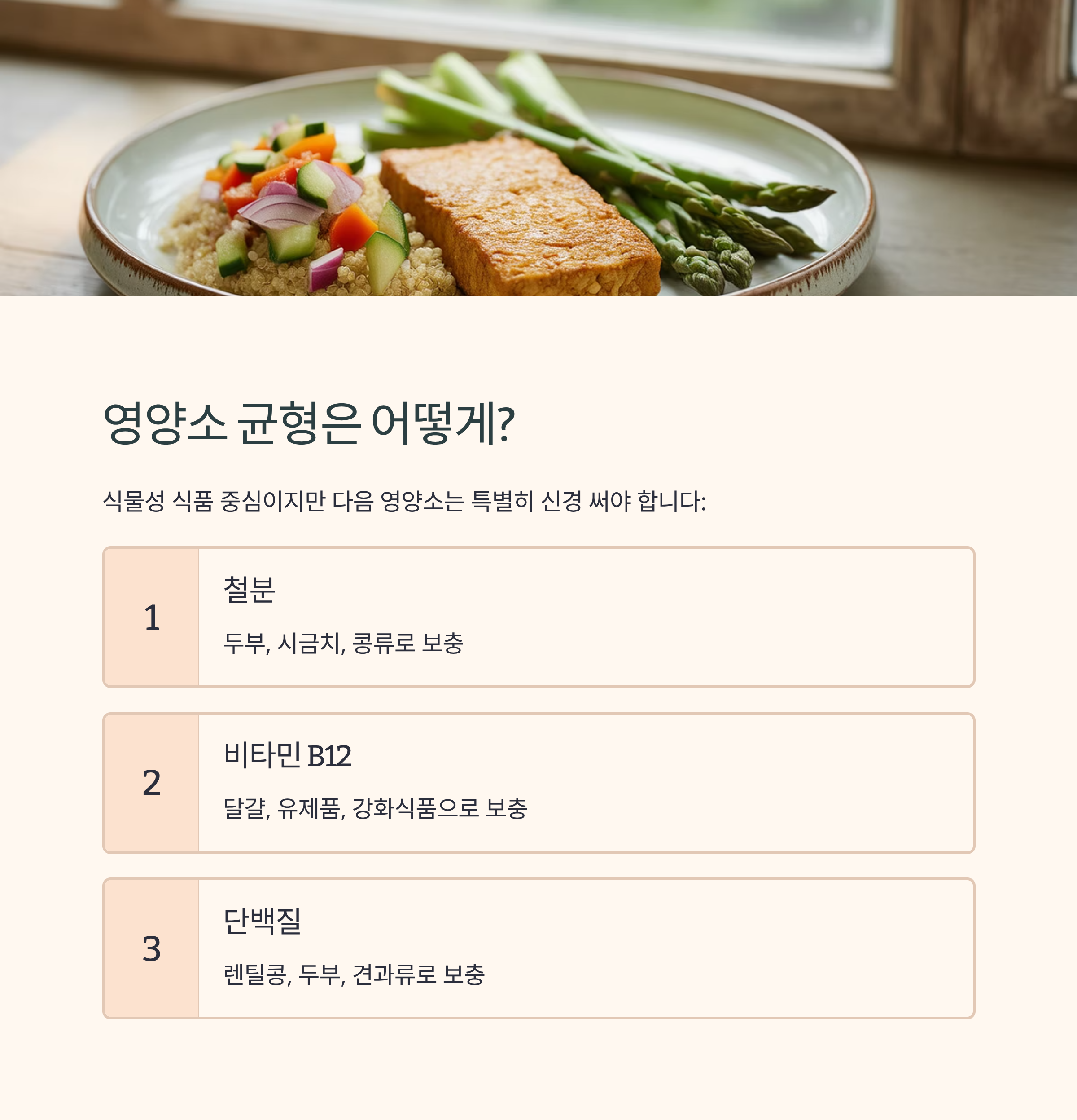 단백질, 철분, 비타민 B12, 오메가-3 등은 의식적으로 섭취하는 것이 중요합니다.