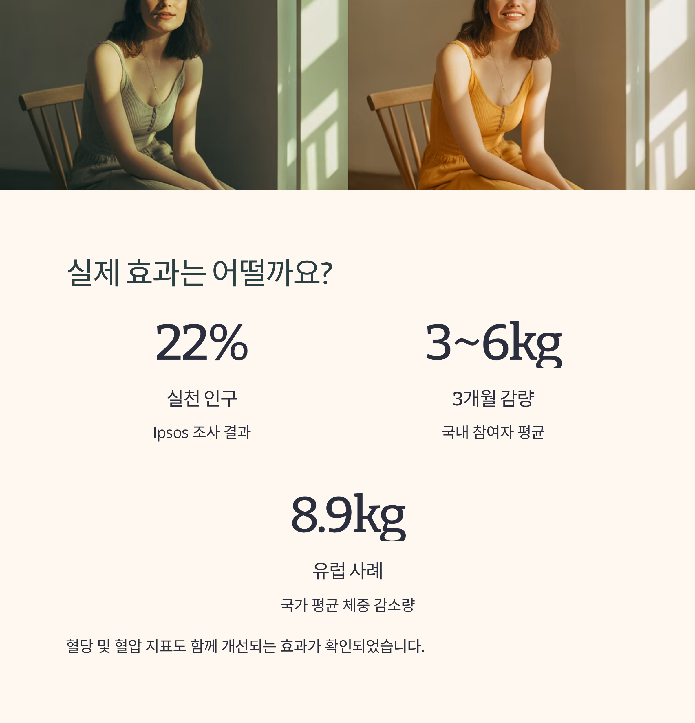 체중이 3kg~6kg 줄었다는 보고와 함께 혈당 및 혈압 지표도 개선됐다는 결과가 확인되고 있습니다.