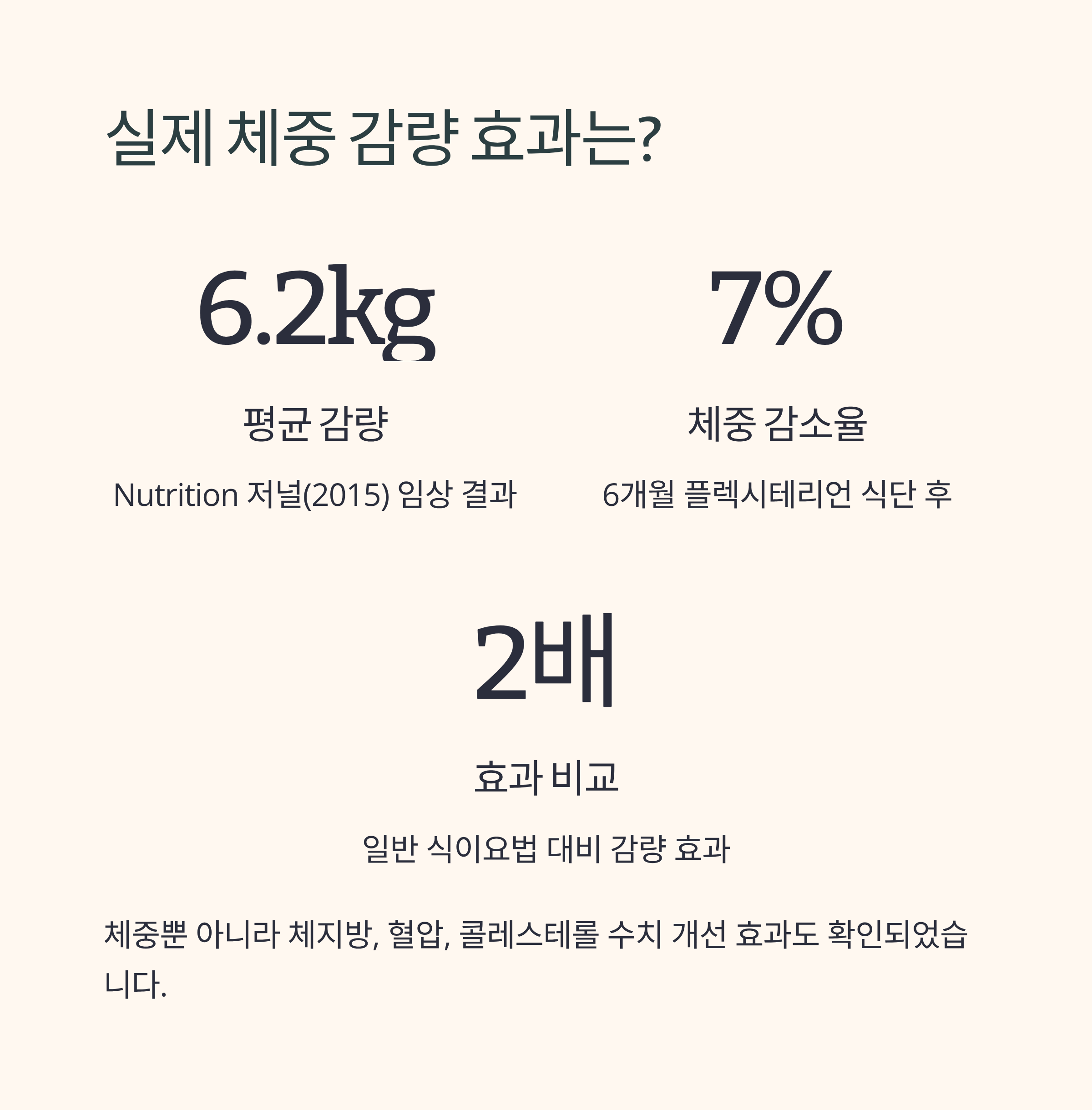 Nutrition 저널(2015년)에서 진행된 임상에서는 플렉시테리언 그룹이 6개월간 평균 6.2kg 감량하며,