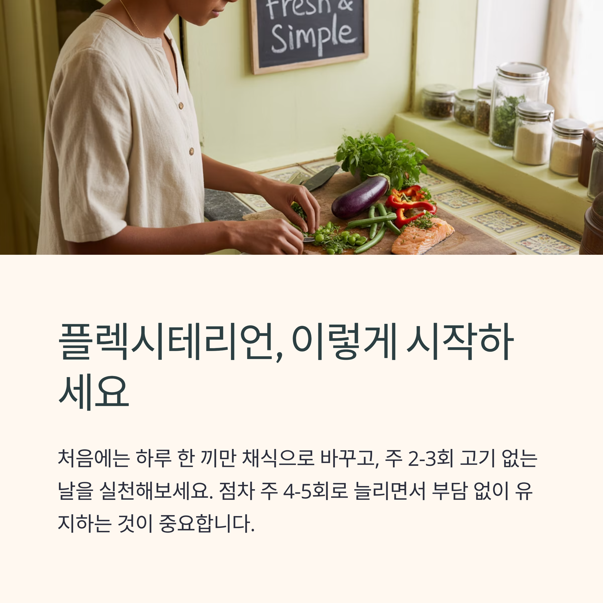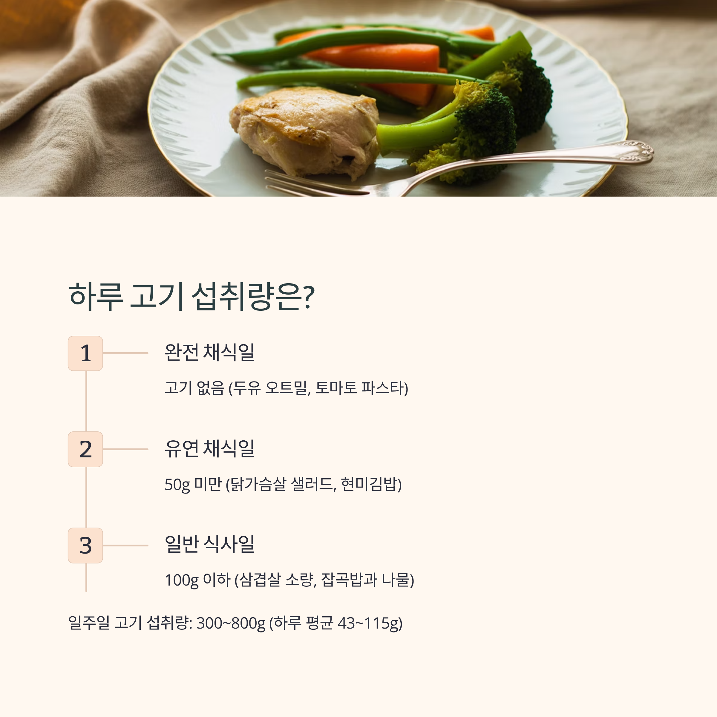 예를 들어 평일 5일은 채식 위주로, 주말 2일만 고기를 소량 섭취하는 식으로 접근할 수 있습니다.