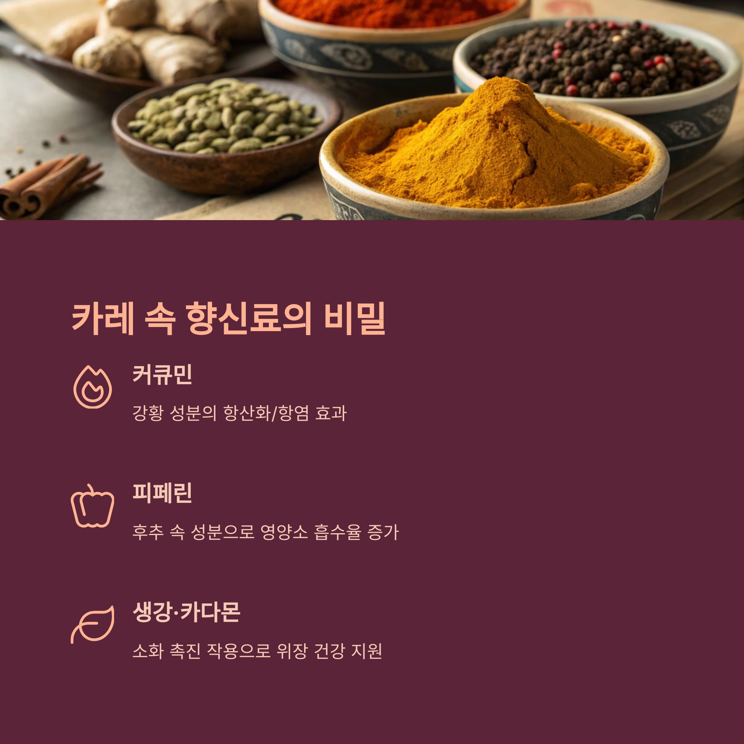 카레는 단순한 맛이 아닙니다. 강황, 큐민, 생강 등의 향신료가 뇌 기능 회복과 항산화 작용을 유도합니다.