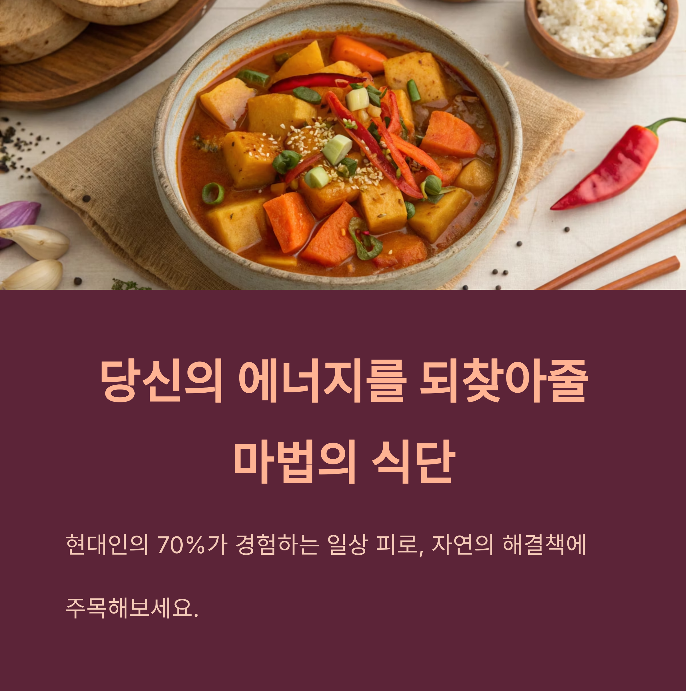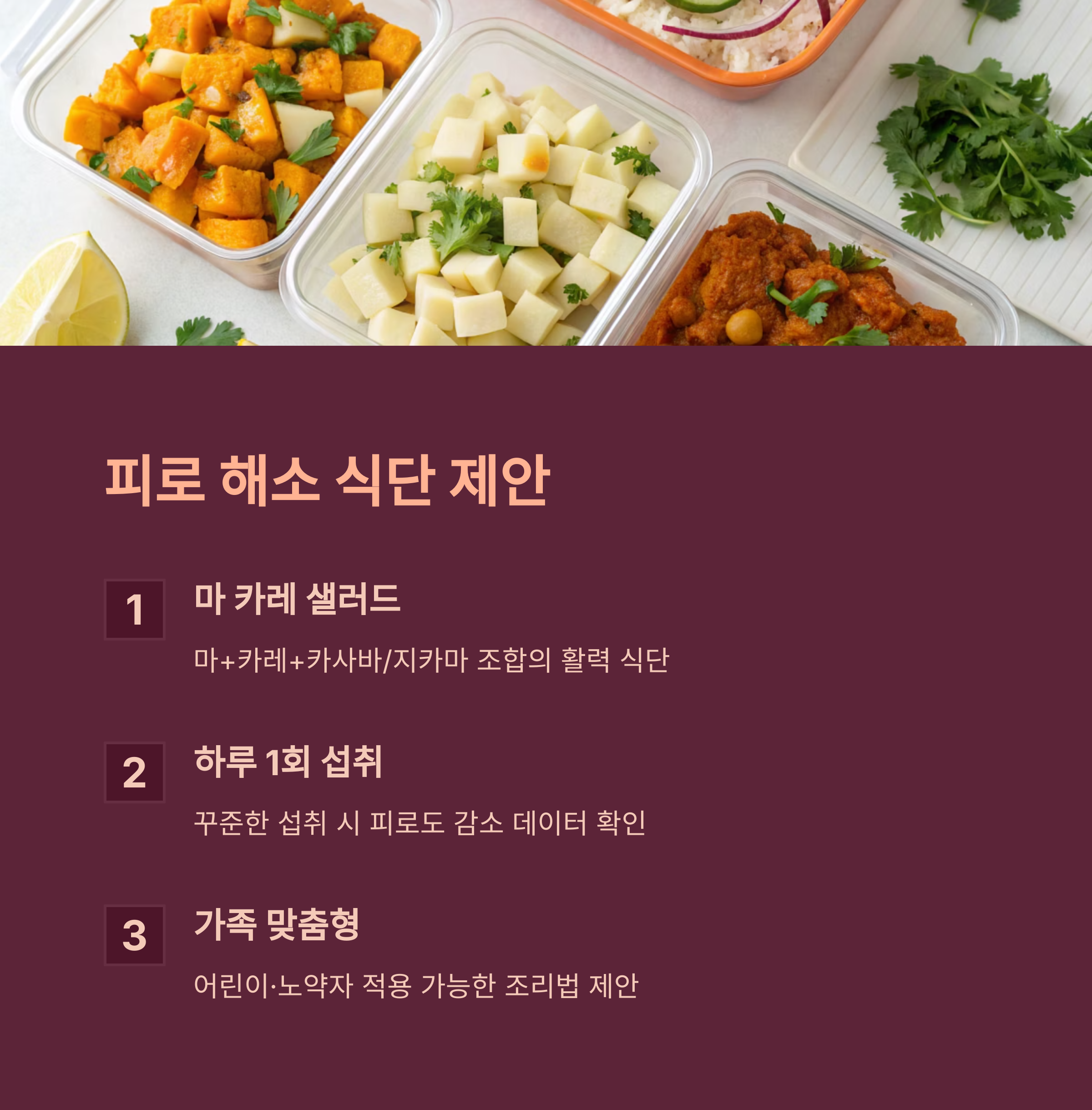 또한 마의 소화 촉진 성분과 카레의 신진대사 촉진 작용이 함께 작동하면서 더 빠른 피로 회복을 유도합니다.