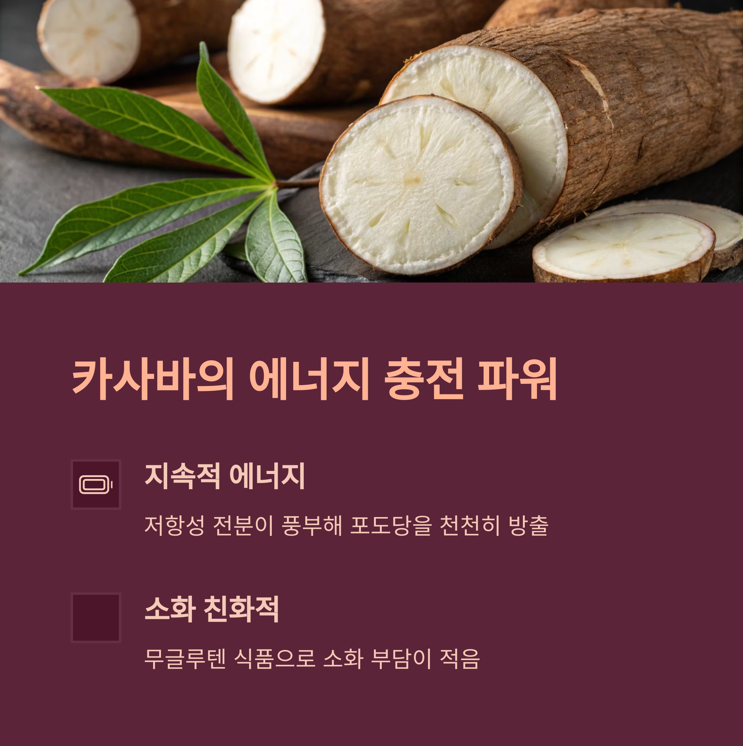 카사바는 고탄수화물 식품으로 빠르게 에너지를 공급해줍니다.
