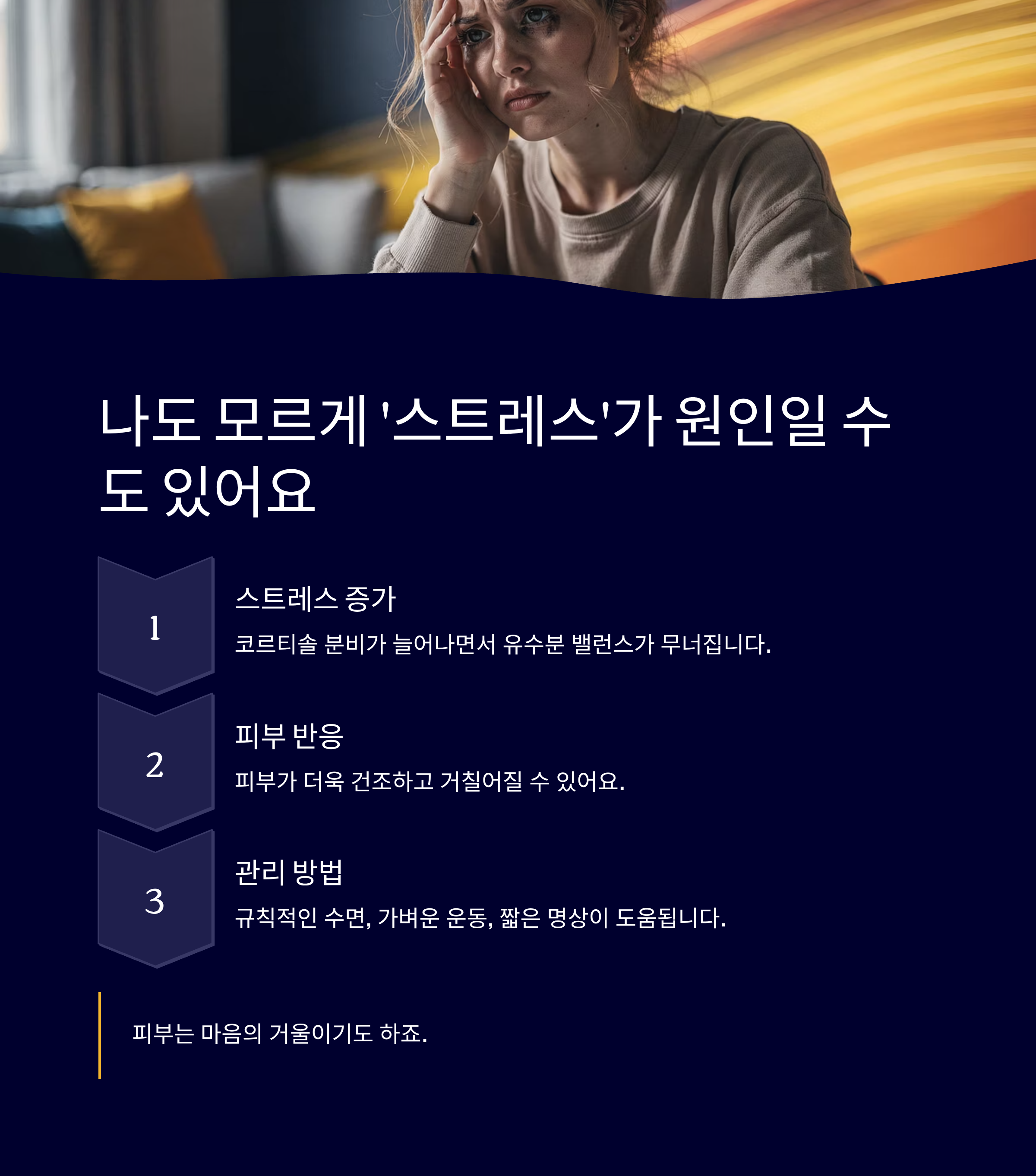 스트레스를 받으면 피부는 민감하게 반응합니다. 코르티솔 분비가 늘어나면서 유수분 밸런스가 무너지기 쉽고, 이로 인해 피부가 더욱 건조하고 거칠어질 수 있어요.