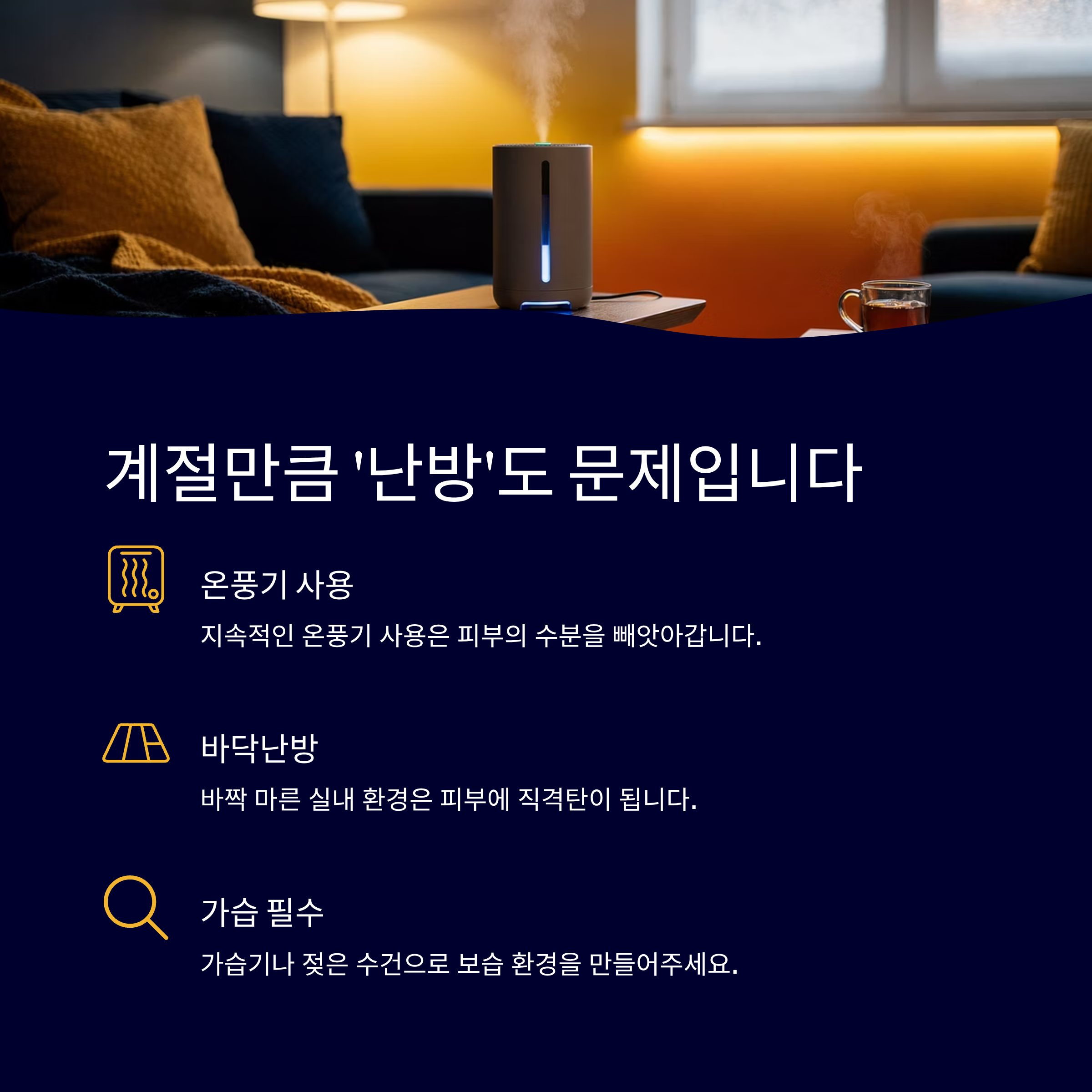 겨울철 실내 난방은 습도만 낮추는 것이 아닙니다. 지속적인 온풍기 사용, 바닥난방 등은 피부의 수분을 더욱 빼앗아가죠. 바짝 마른 실내 환경은 피부에도 직격탄이 됩니다.