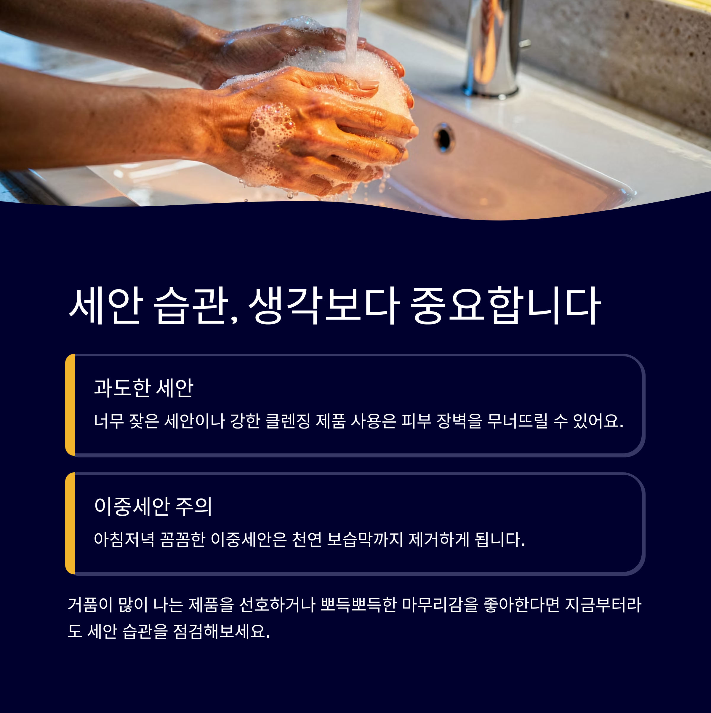 거품이 많이 나는 제품을 선호하거나, 뽀득뽀득한 마무리감을 좋아한다면 지금부터라도 세안 습관을 점검해보세요.