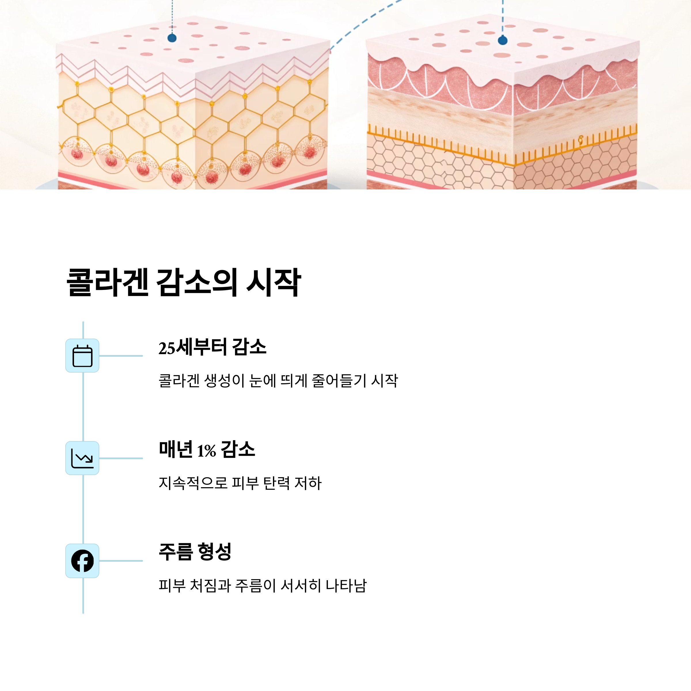 보통 20대 중후반부터 콜라겐 감소가 시작되므로, 25세 이후부터 관리하는 것이 효과적이에요.