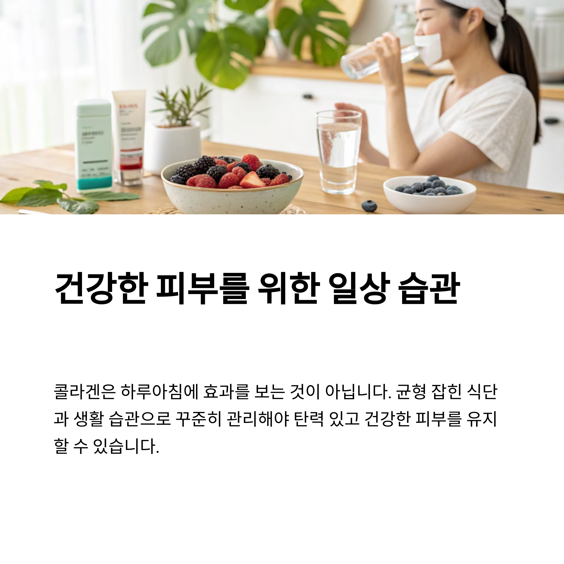 콜라겐 섭취도 중요하지만, 충분한 수분 섭취와 균형 잡힌 영양 관리가 함께 이뤄져야 피부 개선 효과를 볼 수 있습니다.