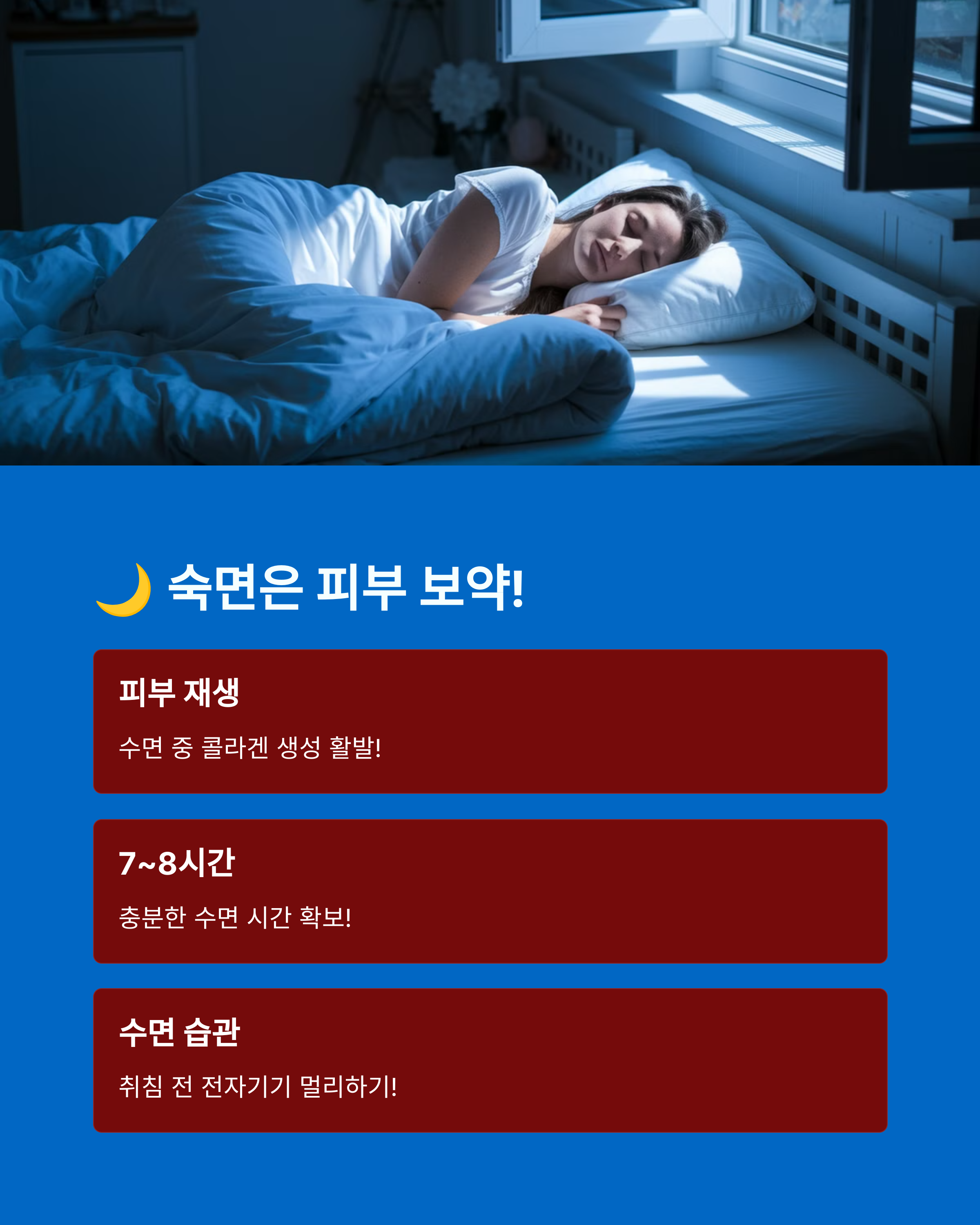피부 보습도 매우 중요합니다. 피부가 건조하면 주름이 생기기 쉽고, 탄력이 떨어지기 때문입니다. 하루 2L 이상의 물을 마시고, 히알루론산, 세라마이드가 포함된 고보습 크림을 사용하세요. 특히 자기 전에는 보습 크림을 듬뿍 발라주는 것이 좋습니다. 숙면도 피부 건강에 큰 영향을 미칩니다. 매일 7~8시간의 숙면을 취하면 피부 재생이 활발해지고, 건강한 피부를 유지할 수 있습니다.