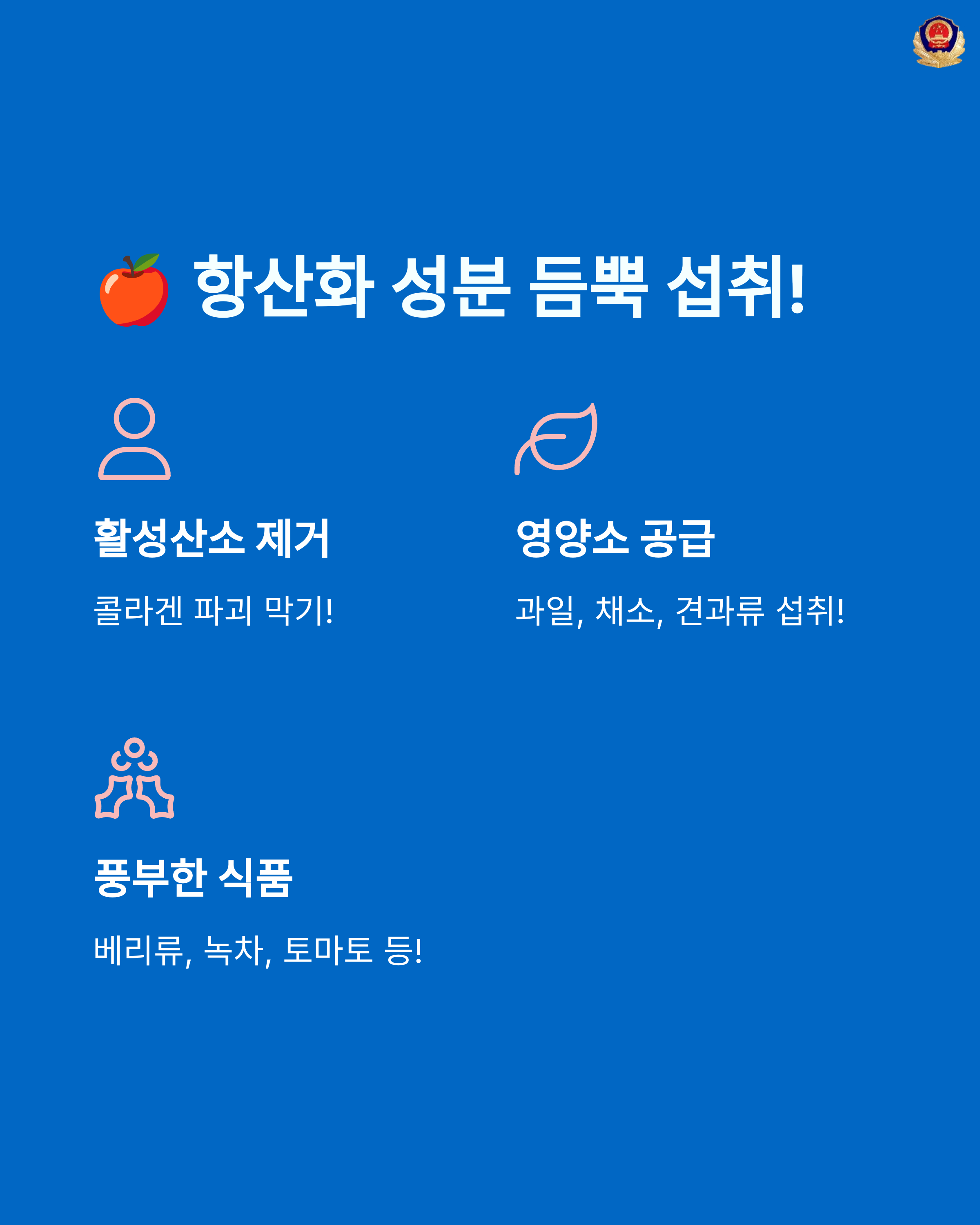 | 항산화 섭취 | 비타민C, E, 폴리페놀 섭취로 피부 보호 효과 UP! |