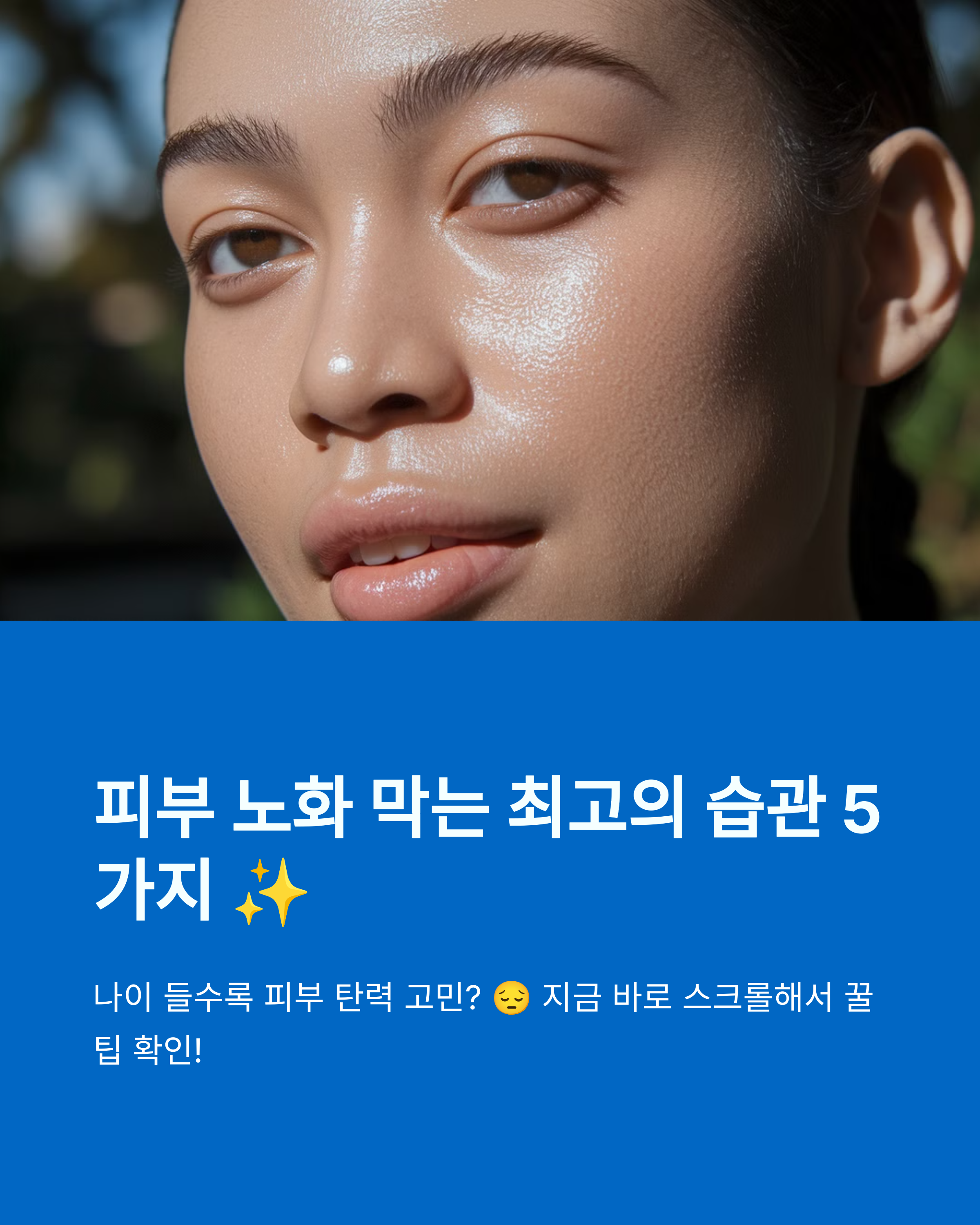 나이가 들수록 피부 탄력이 떨어지고 주름이 생기는 것은 자연스러운 과정입니다. 하지만 생활 습관을 잘 관리하면 피부 노화를 확실히 늦출 수 있다는 사실, 알고 계셨나요? 비싼 화장품을 바르는 것보다 매일 실천하는 작은 습관들이 훨씬 더 중요합니다. 요즘은 20~30대에도 피부 노화를 걱정하는 사람들이 많습니다. 스마트폰, 스트레스, 수면 부족, 잘못된 식습관 등이 피부를 빠르게 늙게 만들죠. 그러나 걱정하지 마세요! 오늘 알려드릴 5가지 피부 노화 방지 습관만 잘 실천해도 피부 나이를 되돌릴 수 있습니다. "피부 관리, 이제부터라도 늦지 않았어요!" 오늘부터라도 자외선 차단, 항산화, 수분 공급, 숙면, 건강한 식단을 실천해 보세요.
