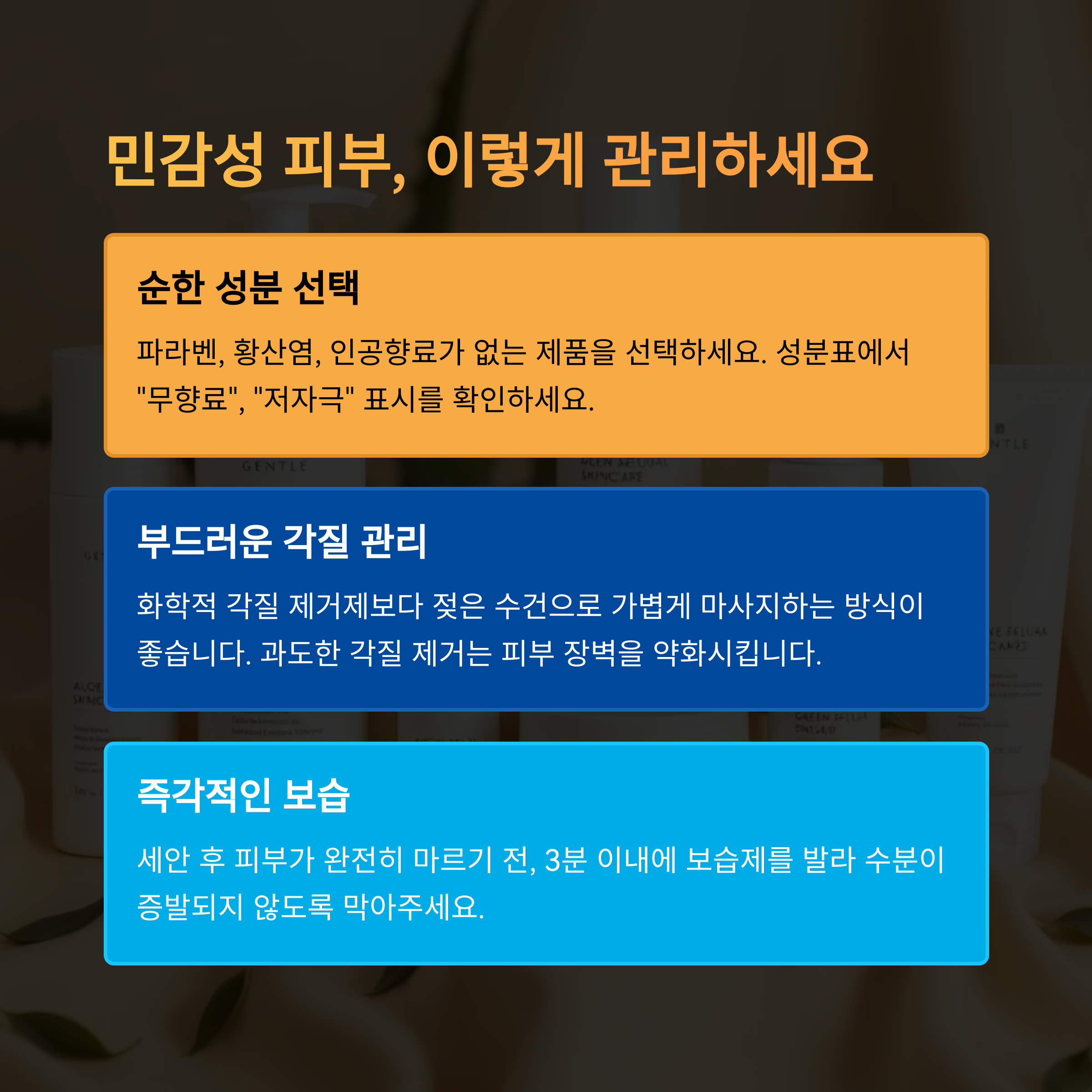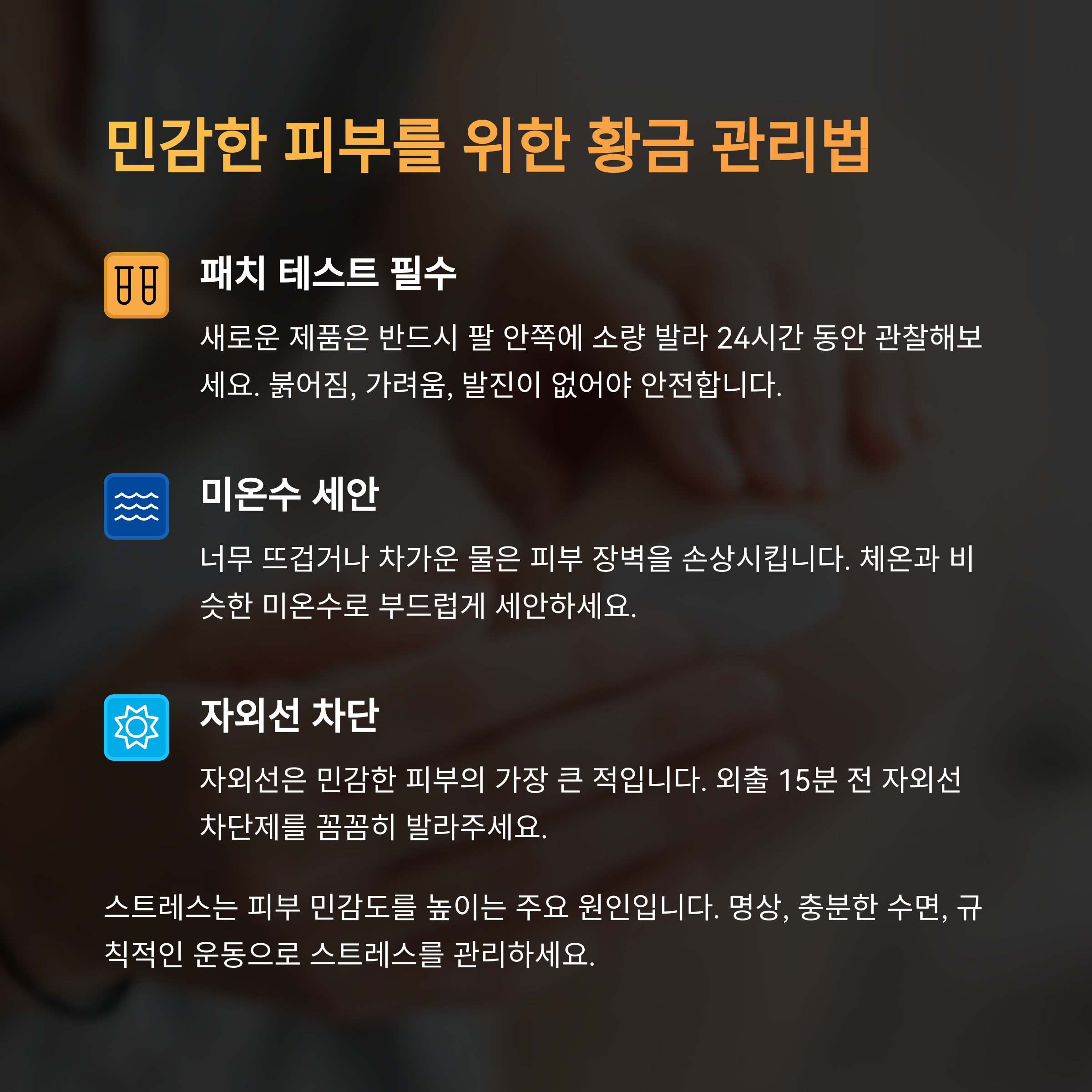 민감한 피부를 가진 분들께 가장 중요한 건 피부의 방어력을 유지하는 것이에요. 외부 자극에 쉽게 반응하는 피부일수록, 사소한 습관 하나하나가 큰 차이를 만들죠. 먼저 새 제품을 사용하기 전엔 꼭 패치 테스트를 하세요. 손목 안쪽이나 귀 뒤쪽에 테스트해보면, 피부가 어떻게 반응하는지 미리 알 수 있어요. 또 자외선 차단은 필수예요. 햇빛에 장시간 노출되면 피부 장벽이 약해지고 염증 반응이 생기기 쉬워요.