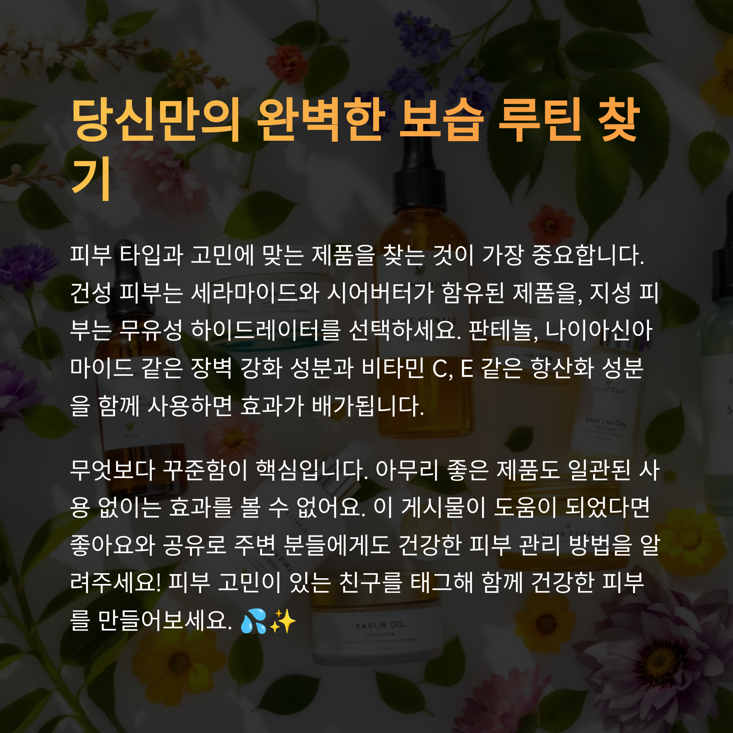 자연이 주는 힘, 생각보다 훨씬 더 놀랍죠? 화학 성분에 지친 피부라면 오늘부터라도 자연 유래 성분으로 전환해보세요. 민감한 피부도 부드럽게 감싸주는 보습 루틴, 조금만 신경 쓰면 충분히 실천할 수 있어요. 여러분의 피부가 조금 더 편안해지길, 그리고 매일 거울을 보며 미소 지을 수 있길 진심으로 바랄게요. 궁금한 점이나 경험담이 있다면 댓글로 편하게 나눠주세요. 함께 더 나은 피부를 만들어가요!