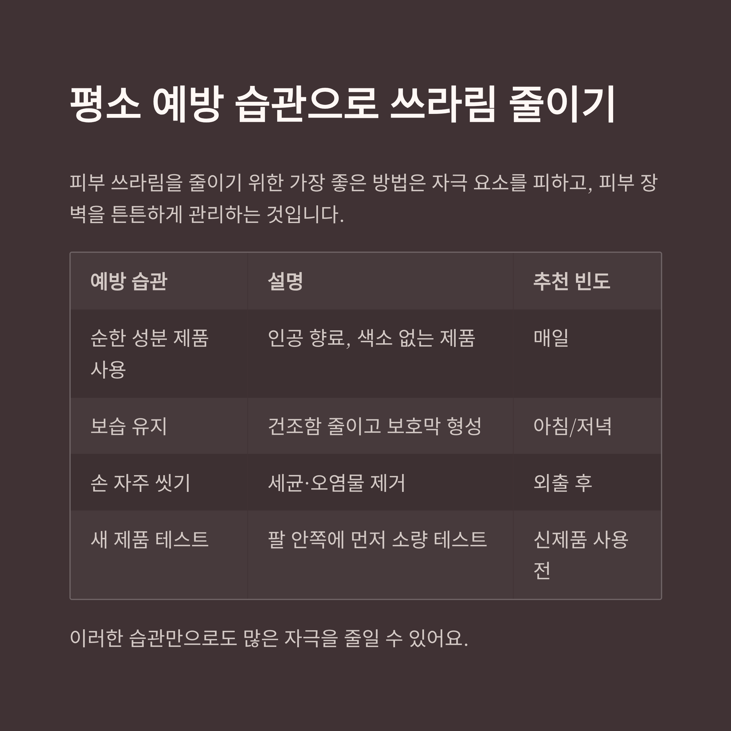 | 순한 성분 제품 사용 | 인공 향료, 색소 없는 제품 | 매일 |