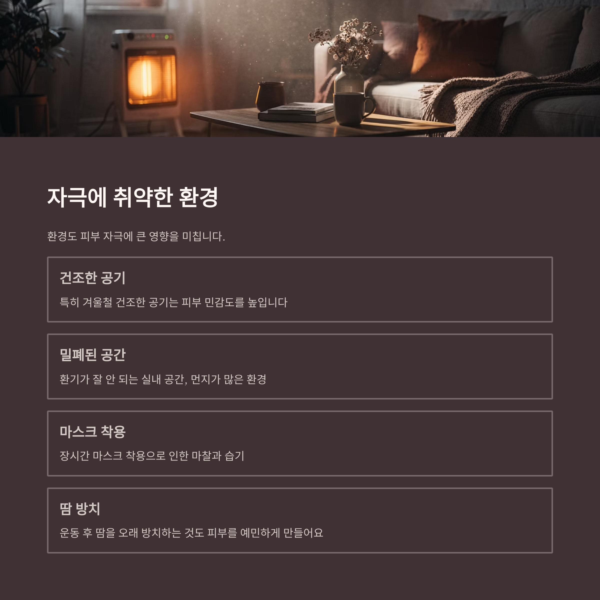 환경도 피부 자극에 큰 영향을 미칩니다. 특히 겨울철 건조한 공기, 환기가 잘 안 되는 실내 공간, 먼지가 많은 환경 등은 피부 민감도를 높입니다.
