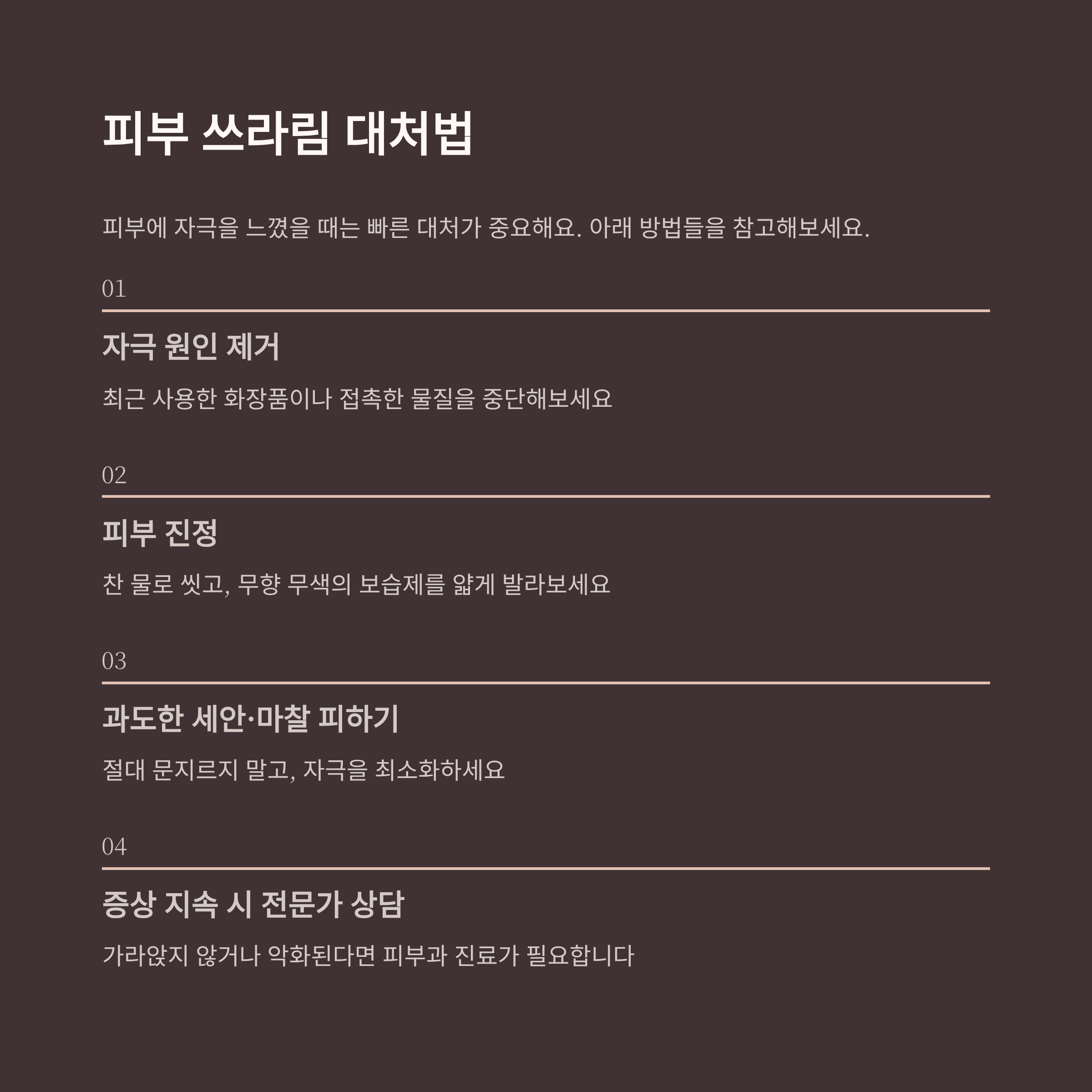 피부에 자극을 느꼈을 때는 빠른 대처가 중요해요. 아래 방법들을 참고해보세요.