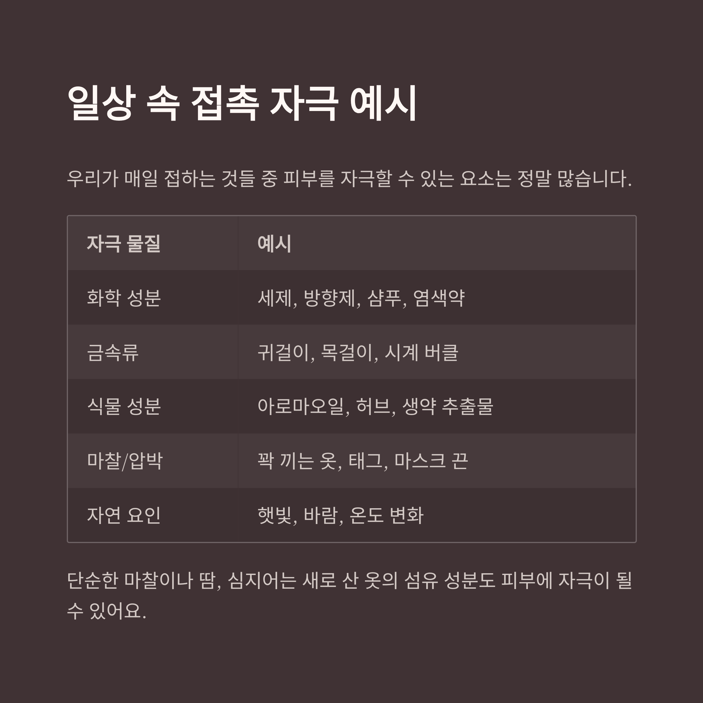 우리가 매일 접하는 것들 중 피부를 자극할 수 있는 요소는 정말 많습니다.