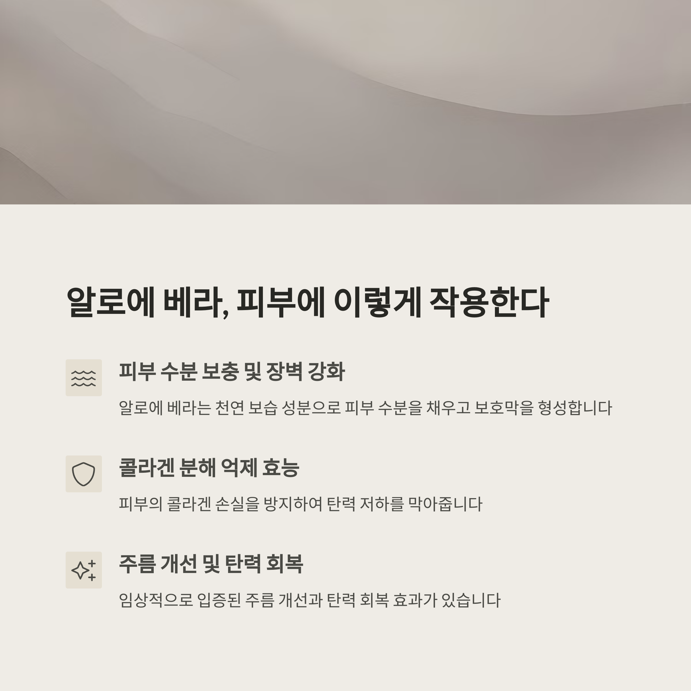 피부 탄력은 콜라겐과 엘라스틴 같은 섬유 단백질에 의해 유지되며, 나이가 들수록 자연스럽게 감소합니다. 알로에 베라는 이러한 콜라겐 생성을 촉진하는 비타민 C, 비타민 E, 베타카로틴을 풍부하게 함유하고 있어 피부 탄력 유지에 탁월한 효과를 발휘합니다. 서울대 연구팀의 임상시험에서는 45세 이상 여성을 대상으로 알로에 베라 겔을 섭취한 결과, 피부 탄력과 주름 개선에 유의미한 수치 변화가 확인되었습니다. 이는 알로에 베라가 단순 보습을 넘어 피부 구조 개선에 직접적인 기여를 할 수 있음을 시사합니다.
