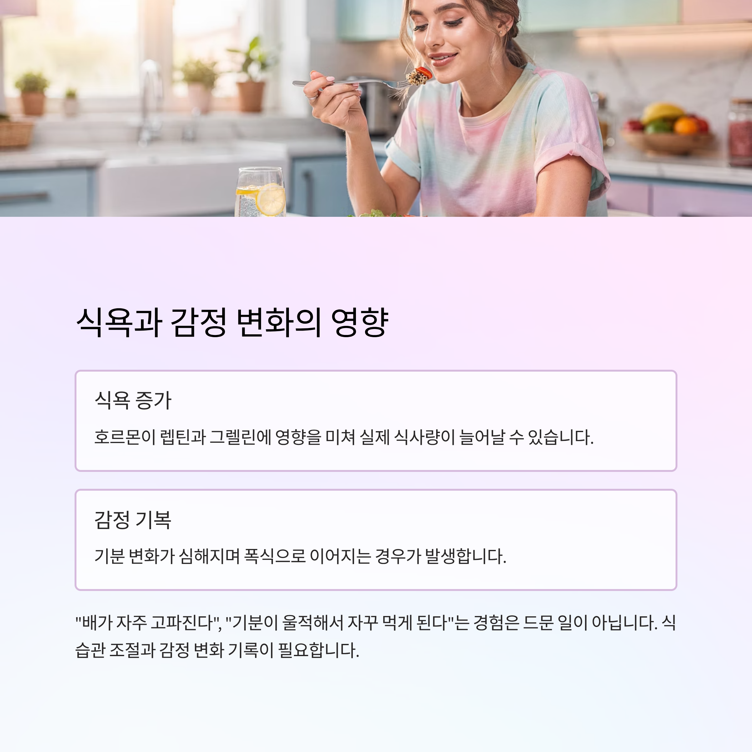 호르몬은 식욕 조절 호르몬인 렙틴과 그렐린에도 영향을 미칠 수 있어 실제로 식사량이 늘어날 수 있고, 감정 기복이 심해지며 폭식으로 이어지는 경우도 있습니다.