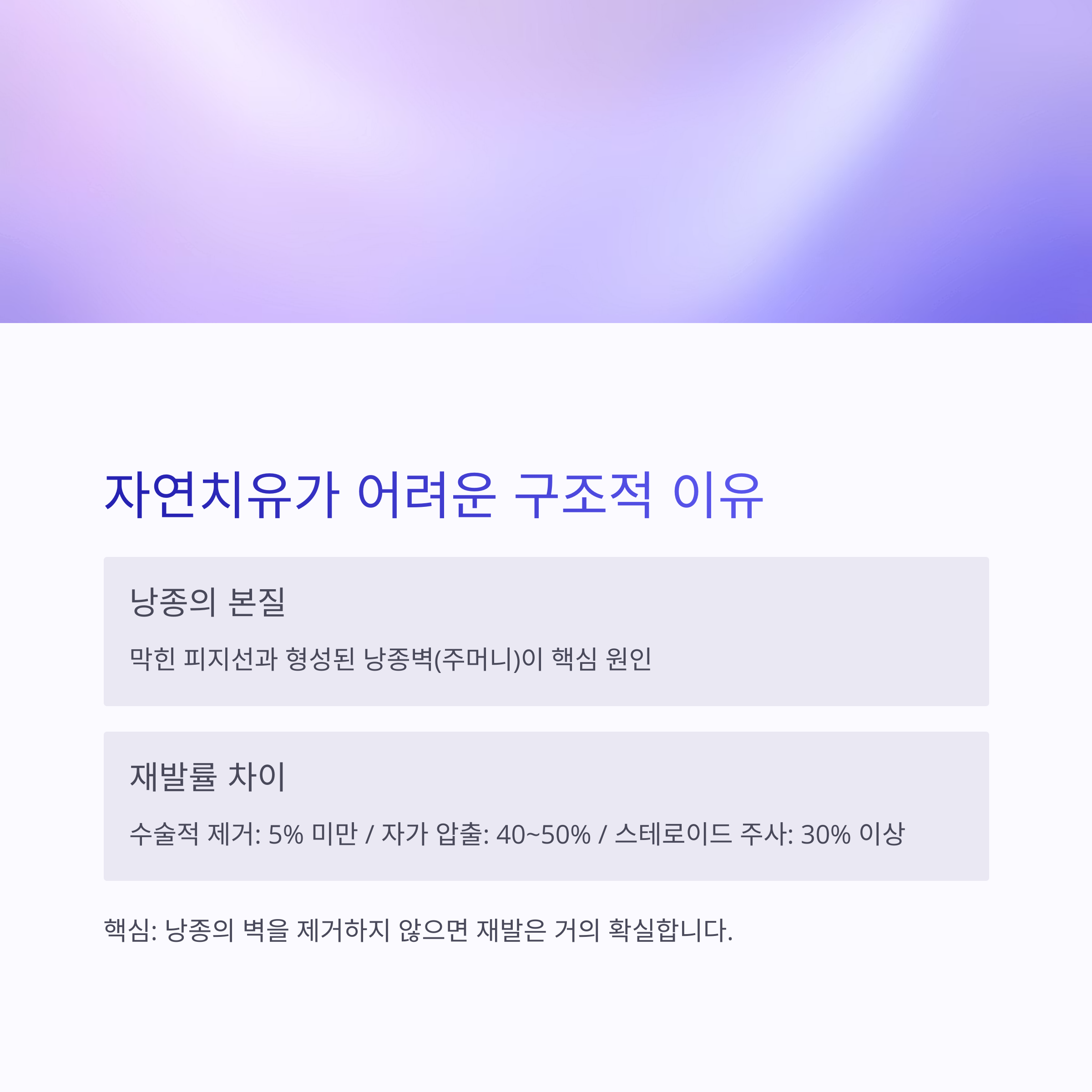 피지낭종은 겉으로 줄어들 수 있어도, 내부의 주머니가 남아 있는 한 자연치유는 어렵고 재발 가능성이 매우 높습니다.