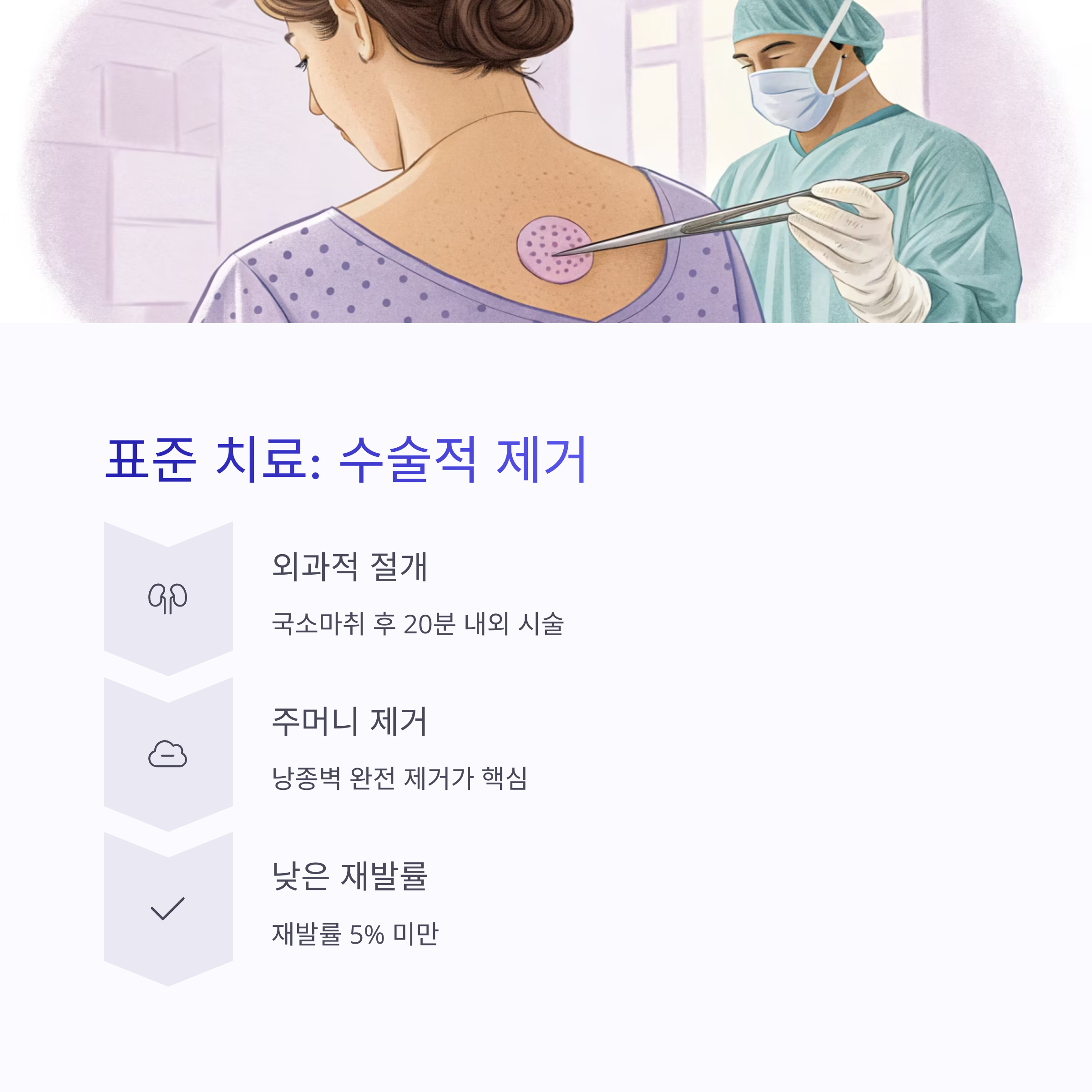 낭종의 벽까지 제거하는 것이 핵심이므로, 전문가에 의한 정확한 시술이 중요합니다.