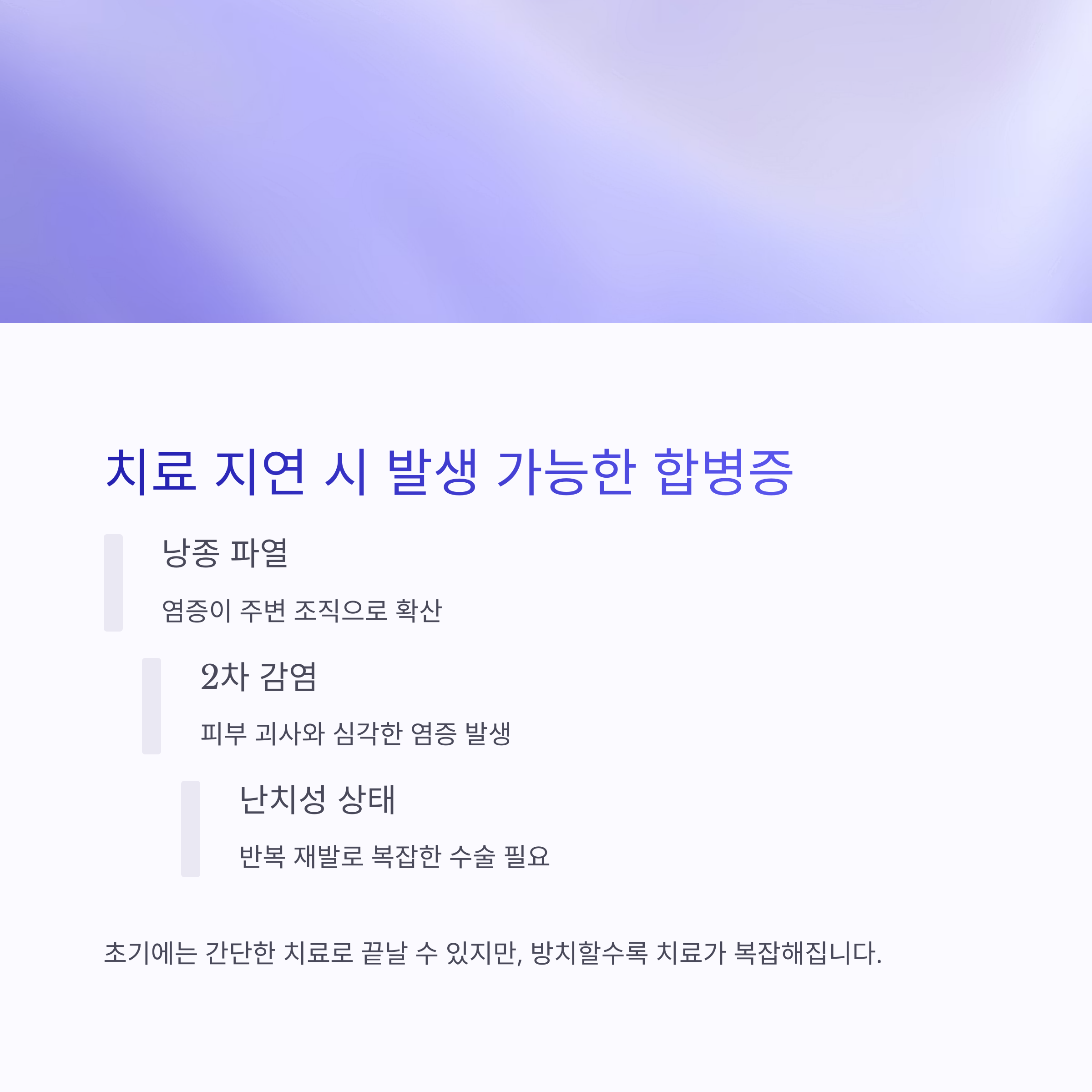 초기에는 간단한 치료로 끝날 수 있지만, 방치할수록 복잡한 수술이 필요할 수 있습니다.