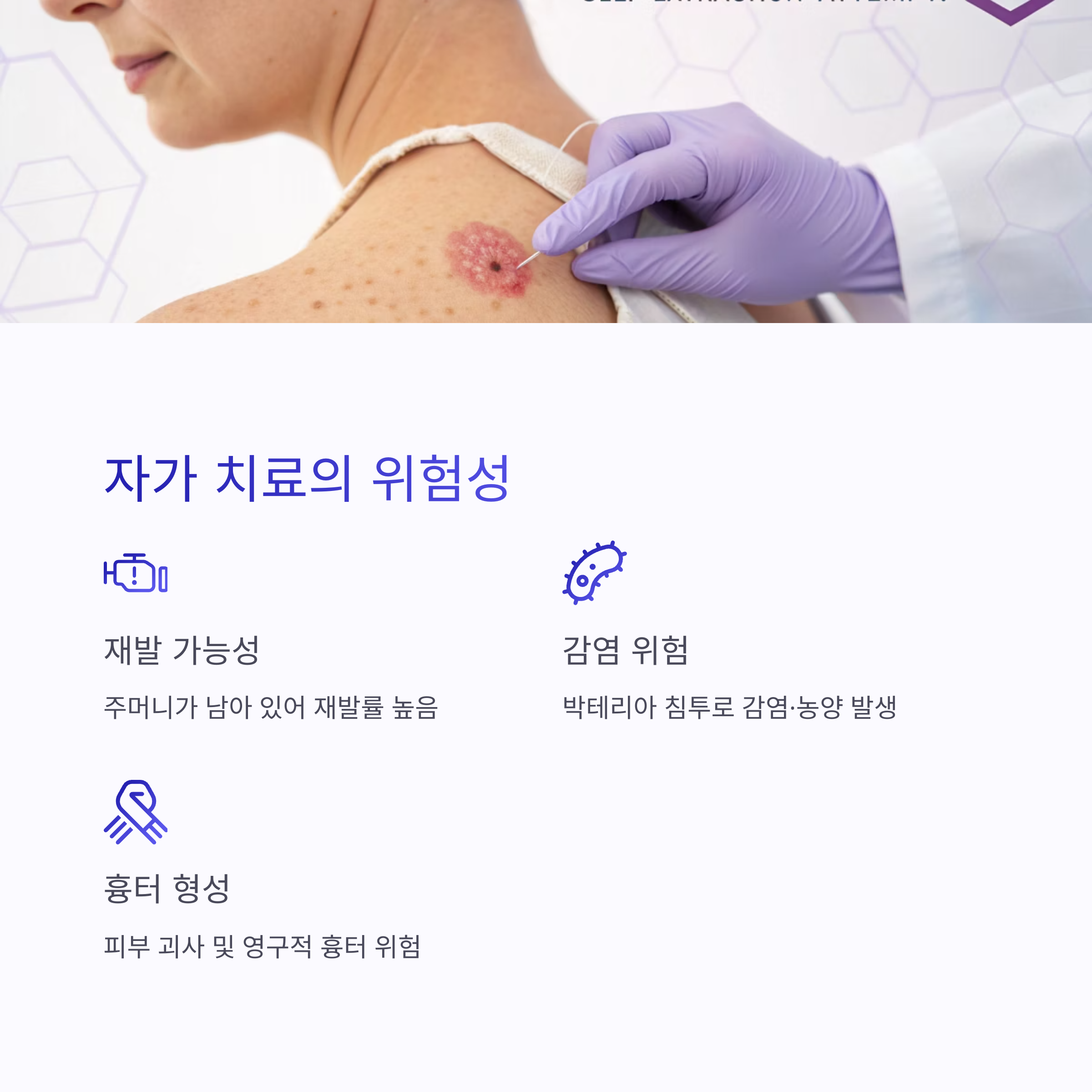 자가 치료는 위험하므로 반드시 피부과 또는 외과 전문의의 상담을 받으시길 권장합니다.