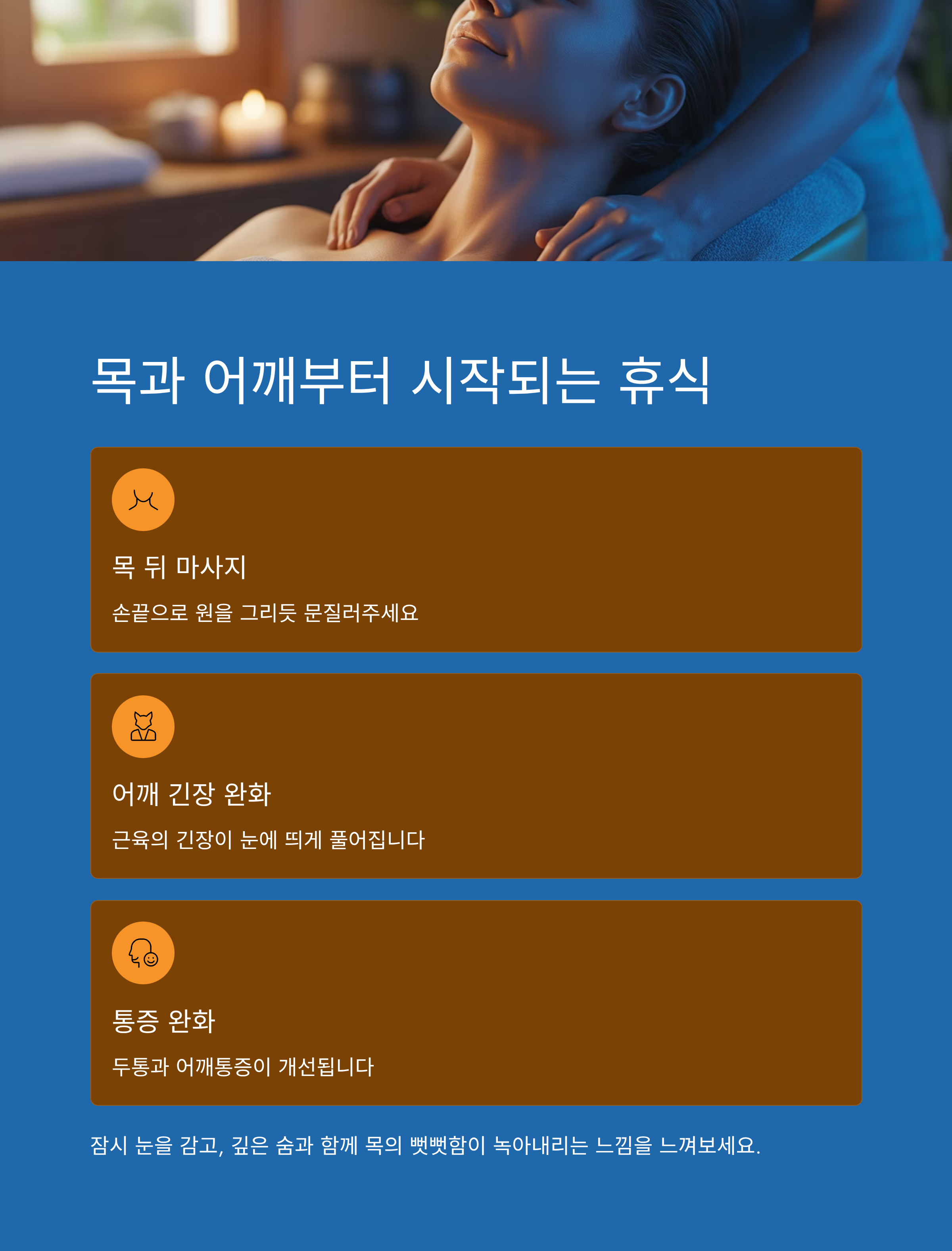 잠시 눈을 감고, 깊은 숨과 함께 목의 뻣뻣함이 녹아내리는 느낌을 느껴보세요.