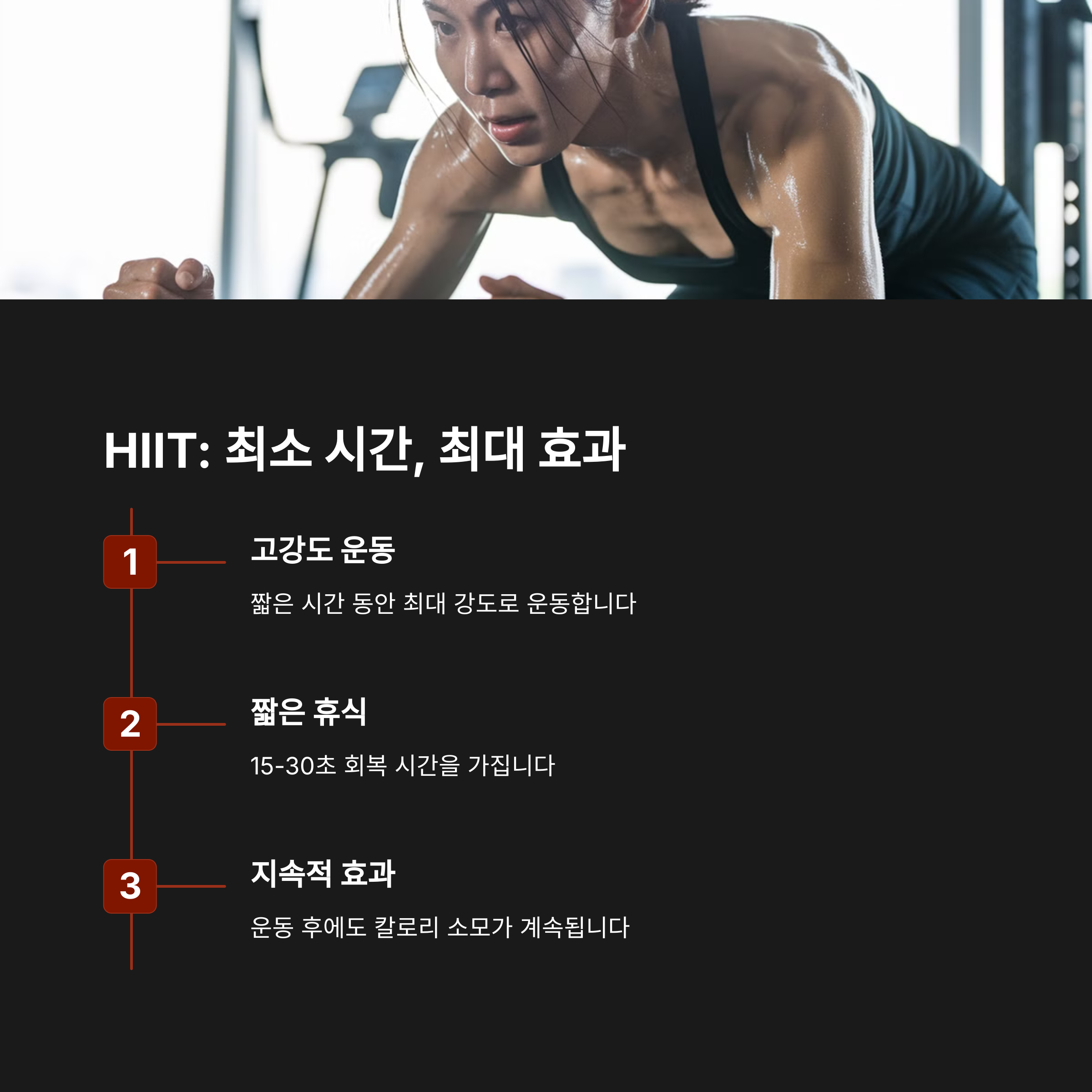 - 고강도 인터벌 트레이닝(HIIT): 30초 운동, 15초 휴식을 반복하여 짧은 시간 내 최대 효과를 노리는 방식.
