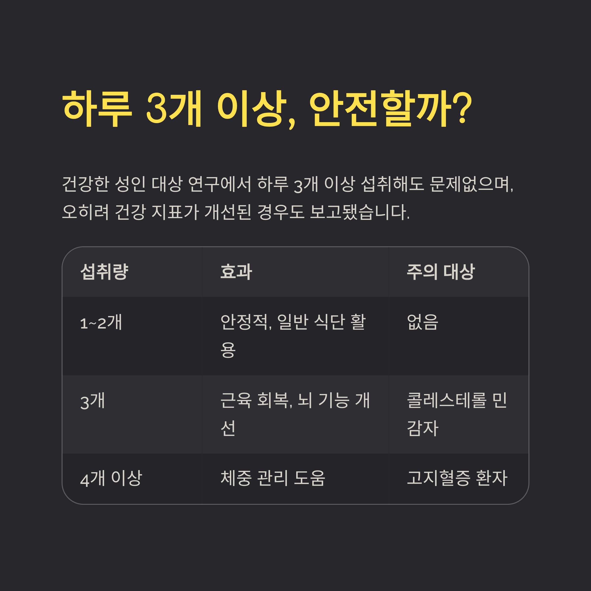 | 3개 | 근육 회복, 뇌 기능 개선, 포만감 상승 | 콜레스테롤 민감자 주의 |